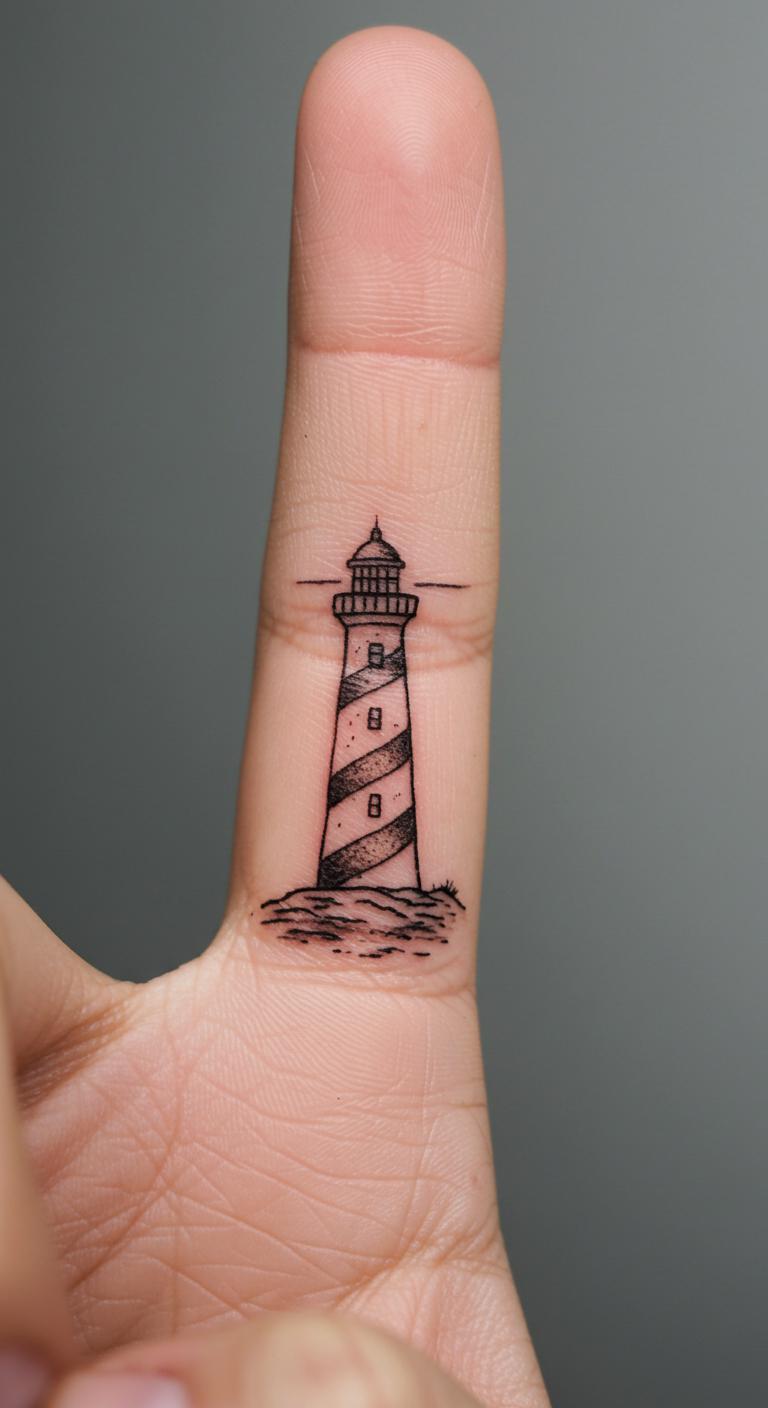 A delicate lighthouse on your finger is subtle. It fits daily wear. Trace light lines at home. Finger tattoos cost around $40. Add a tiny detail, like a dot. Use a thin marker for practice. Finger spots are fast and discreet. They peek out from rings. Go for faint ink to ease pain. Find simple guides online. Show your idea for tweaks. This art stays personal and light.