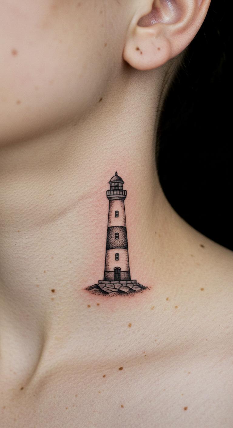 A subtle lighthouse on your neck is elegant. It stands for quiet strength. Sketch a small symbol. Neck ink runs about $70. Add a line for light. Practice with a pen. Neck spots show with hair up. They add a touch of class. Go for simple designs. Use free apps for ideas. Share at the studio. This symbol enhances your look.