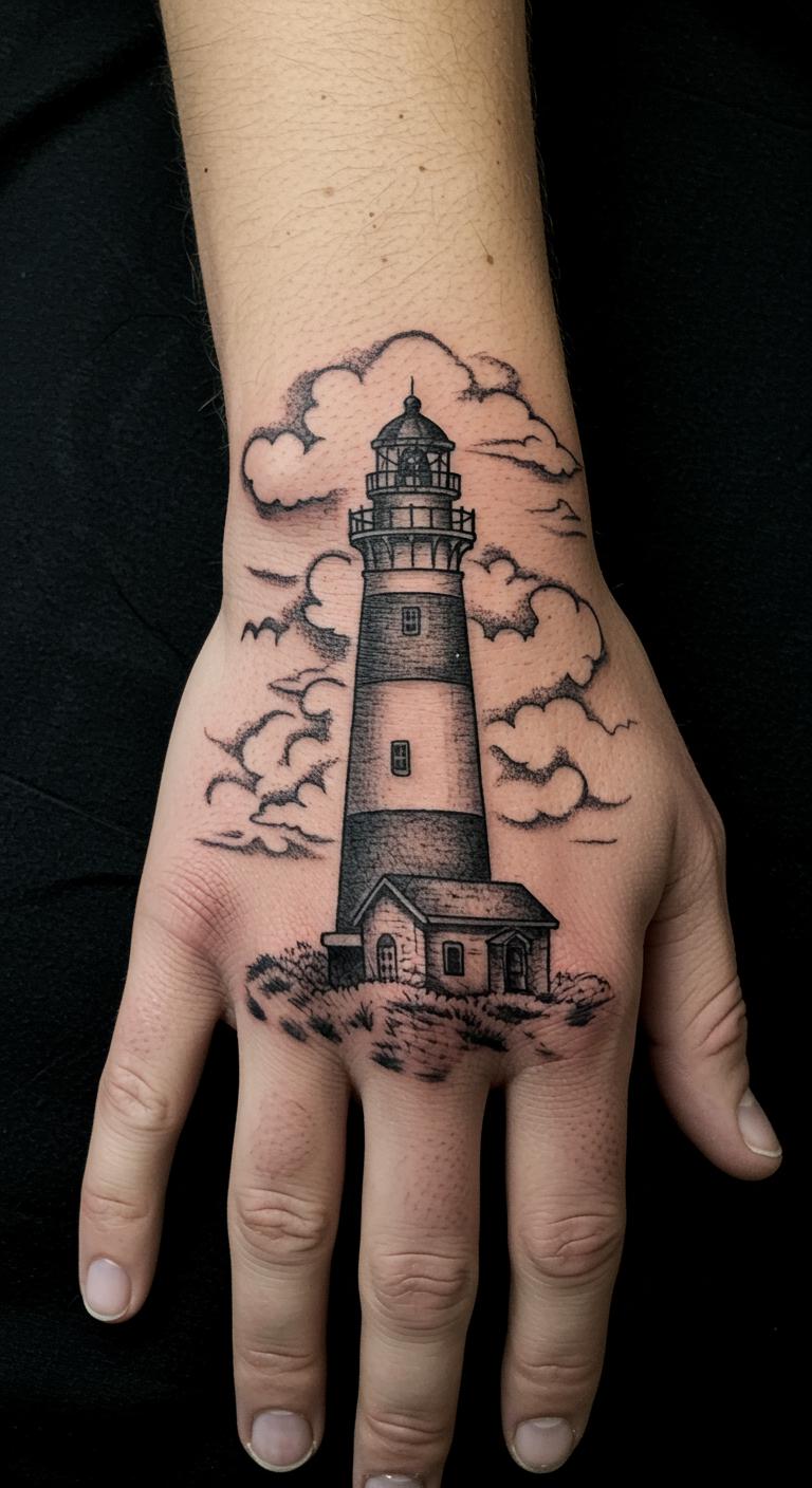 Put a personal lighthouse on your hand. This makes it unique. Add your initials. Hand tattoos cost $60. Draw custom parts at home. Use everyday tools for planning. Hand areas are visible and practical. They work for daily tasks. Choose quick sessions. Find inspiration from videos. Adjust with the artist. This touch makes it yours.