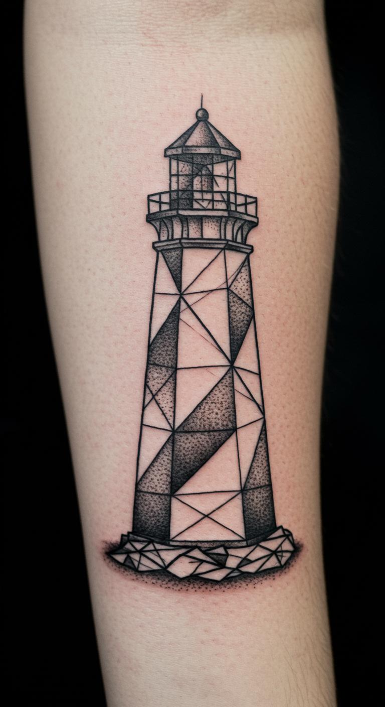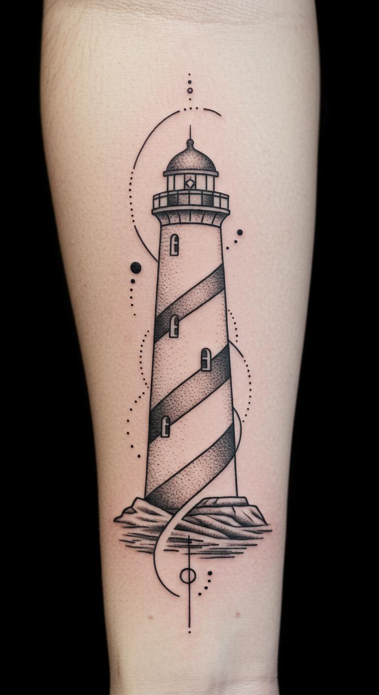 Go abstract with geometric shapes. This modernizes the lighthouse. Draw angled lines. Abstract styles cost $80. Add patterns that matter. Use graph paper for designs. Abstract tattoos fit various spots. They offer a fresh vibe. Keep it to basics. Explore ideas online. Refine with input. This interpretation sparks creativity.