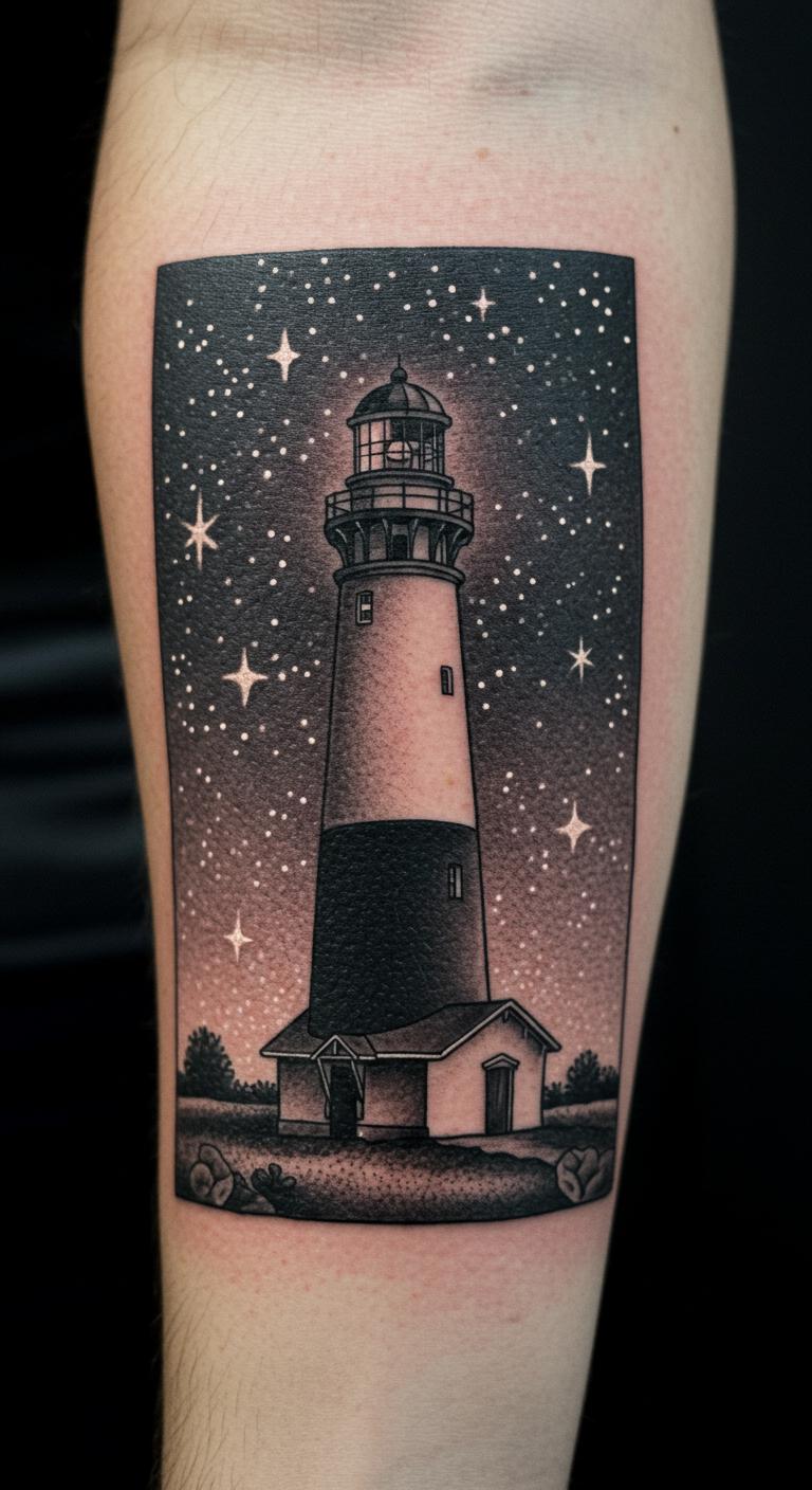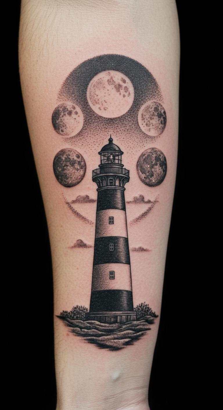 Make it moonlit with circle details. This gives a night feel. Draw moon shapes. Moonlit tattoos cost $80. Add craters. Use night sketches. Moonlit designs work on shoulders. They offer mystery. Go for circular art. Watch moon tutorials. Share your night vision. This lighthouse glows in the dark.