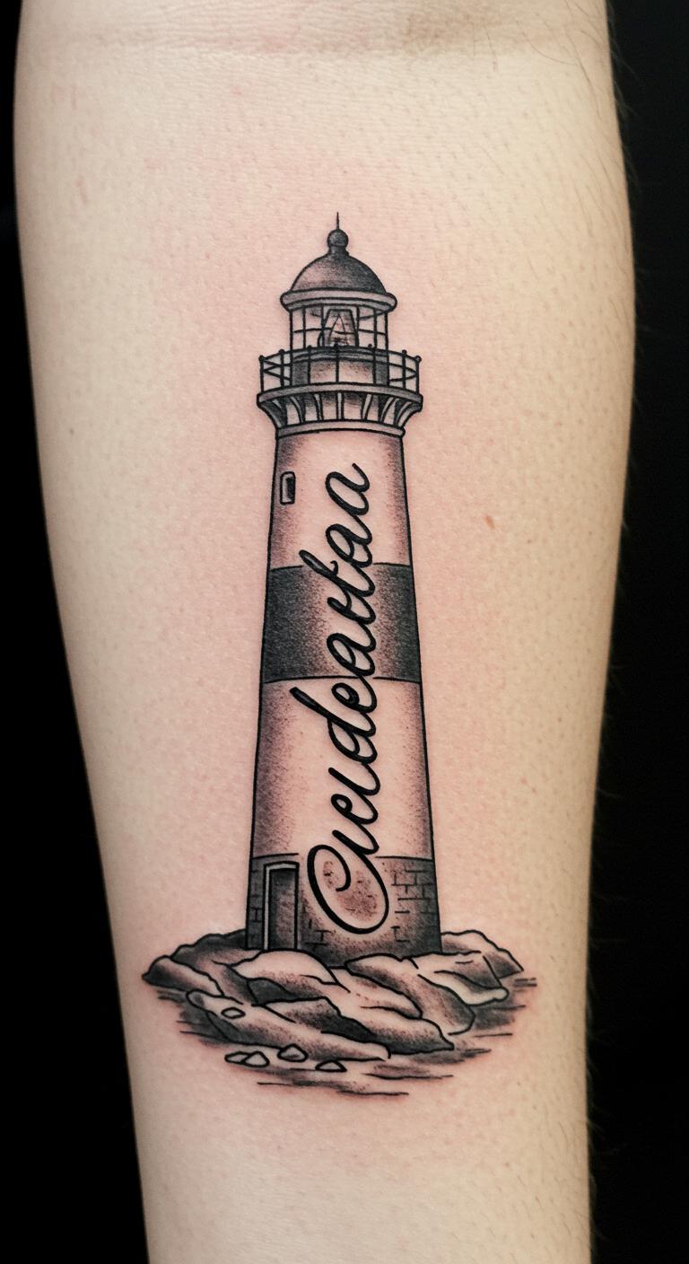 Incorporate a name into the lighthouse. This makes it family-focused. Write the name below. Name tattoos cost $60. Choose fonts that fit. Practice lettering on paper. Name designs go on arms. They hold memories. Opt for integrated styles. Use free font tools. Refine with the artist. This name adds heart.