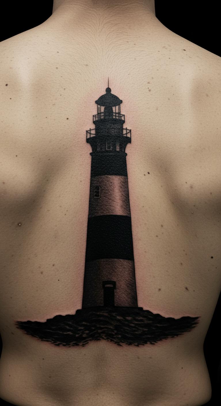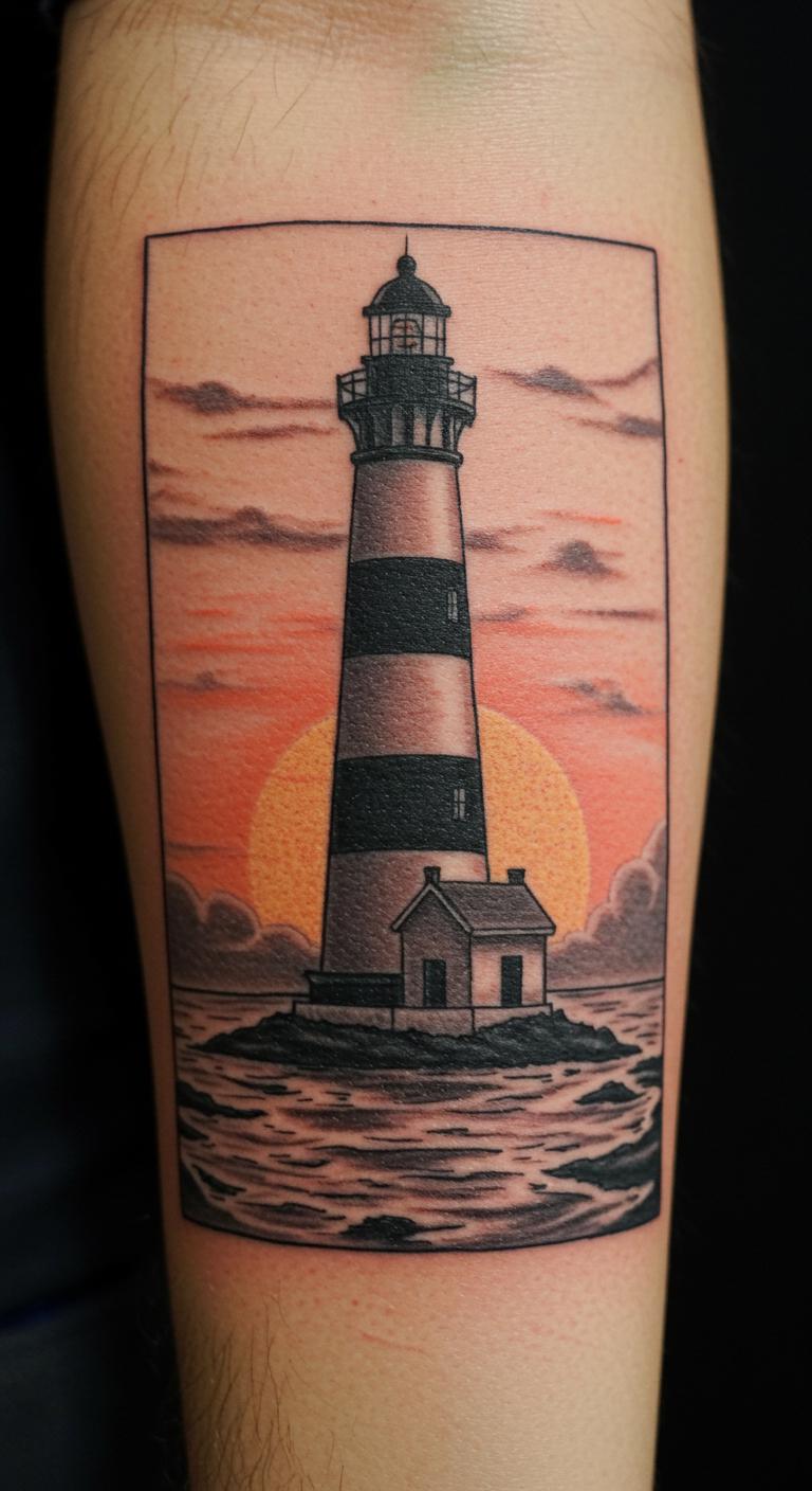 Set the lighthouse against a sunset. This adds warmth. Sketch gradient shades. Backdrop tattoos are $100. Include sun rays. Draw with colored pencils. Backdrop styles suit backs. They evoke peace. Choose layered looks. Find sunset ideas. Refine for effect. This backdrop brings calm.
