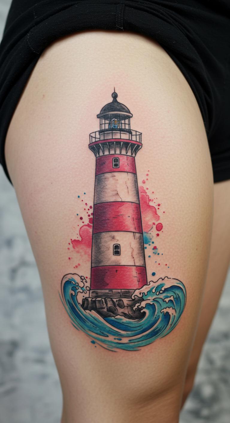 Picture a lighthouse paired with flowing waves. This adds movement to the design. Place it on your thigh for a bigger canvas. Use basic black ink to keep it straightforward. Start by drawing waves freehand at home. Look for artists who charge by the hour, often around $50. Mix in elements from your life, like a favorite sea pattern. Try a DIY stencil with printer paper. This helps plan the layout without extra tools. Go for spots that show off the waves when you want. A thigh spot hides easily under clothes. Opt for single-session tattoos to cut costs. Watch videos on wave drawing for ideas. Bring a photo reference to your appointment. This design tells a story of calm in storms. It fits various skin tones well. Pick an artist who specializes in nature themes. You get a piece that lasts without breaking the bank.