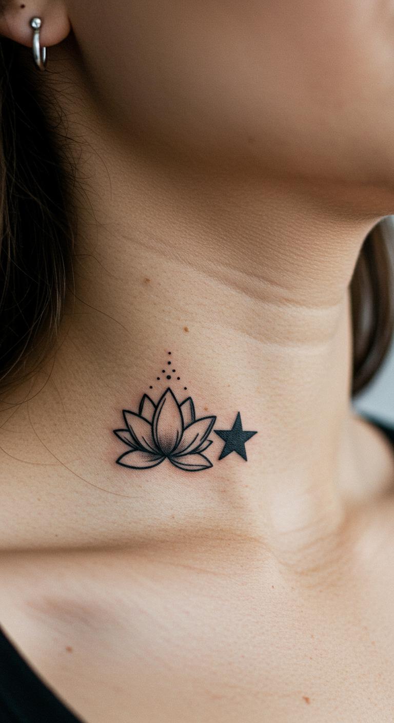 A symbolic star and lotus on your neck adds layered meaning. Sketch stars and flowers on paper first. Quick setup. Artists around $65. Put it on your neck for bold expression. Connect to night skies. Star charts online help designs. Cover with scarves for versatility. This combo enriches stories. Use stickers to preview. It symbolizes guidance clearly.