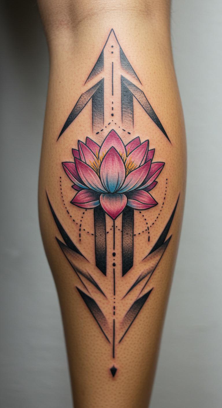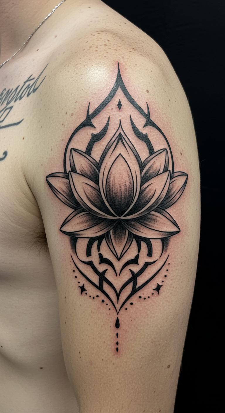 A tribal-edged lotus on your shoulder mixes edge with elegance. Use a black marker to draw rough edges on paper at home. It’s quick and free. Expect to pay under $90 at a nearby studio. Place it on your shoulder for easy coverage with shirts. Blend it with outdoor activities for a bold statement. Search for tribal patterns online to customize. Clean with mild soap twice a day after getting it. This idea appeals to adventure seekers. Practice on scrap paper for better results. It grows more meaningful with wear.
