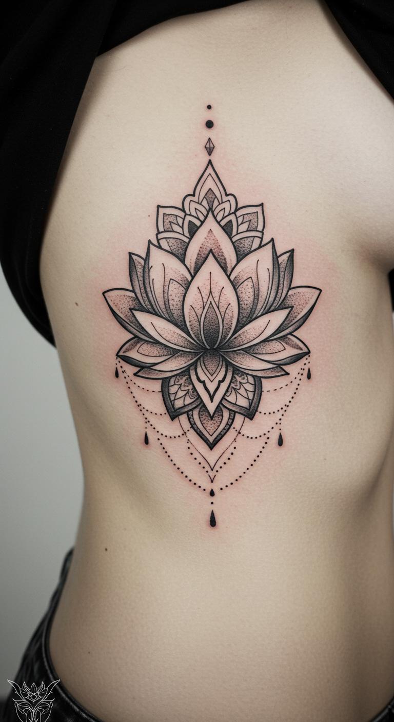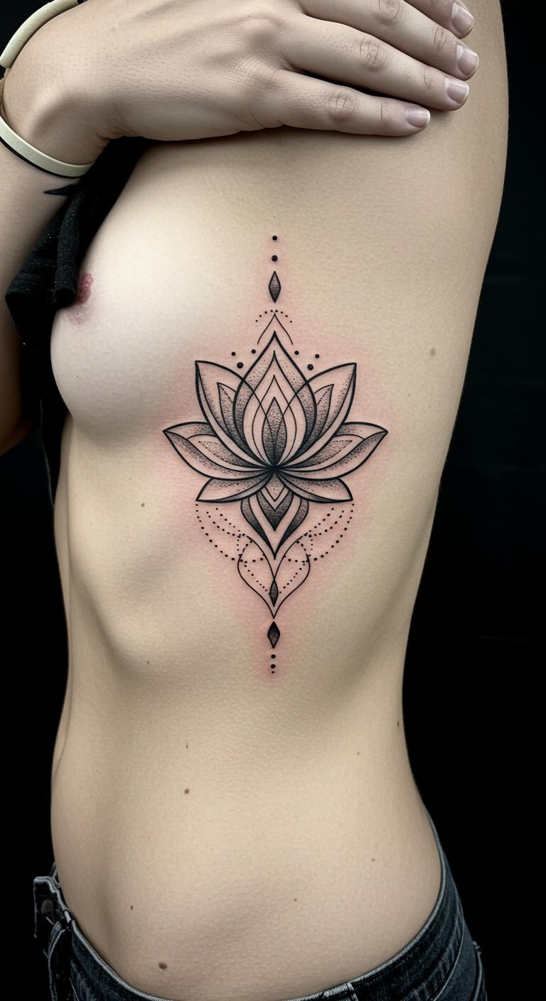 A cultural fusion lotus on your rib merges traditions creatively. Combine symbols on paper using a pen. Easy at home. Shops may charge $85. Opt for your rib to keep it personal. Tie it to family stories. Cultural art online offers fusion ideas. Use breathable bandages for care. It’s great for heritage pride. Sketch fusions on maps for practice. This design tells a deeper tale.