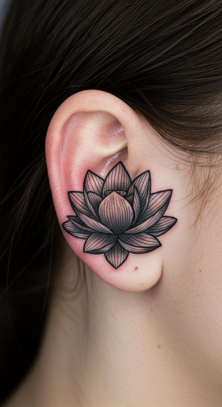 A 3D popping lotus on your ear creates surprising depth. Practice shading with a regular pen on paper. It helps visualize the effect. Look for artists at $60 or less. Choose your ear for a unique, hidden spot. Wear earrings to complement it. Free tutorials online can guide your sketches. Keep the area dry for a few days post-tattoo. This design stands out subtly. Try clay molding at home for a 3D mockup. It adds a modern twist to tradition.
