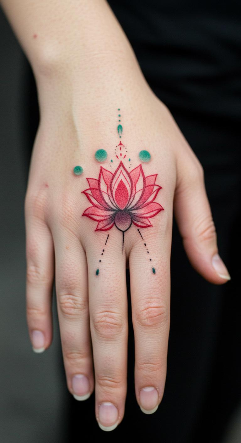 A color-mixed lotus on your finger adds a vibrant yet simple note. Mix colors with markers on paper to plan. Simple and free. Expect $50 at local spots. Place it on your finger for constant reminders. Pair with rings for fun. Online color palettes can spark ideas. Protect with clear tape initially. This works for color enthusiasts. Test with nail polish designs. It brings joy in small ways.