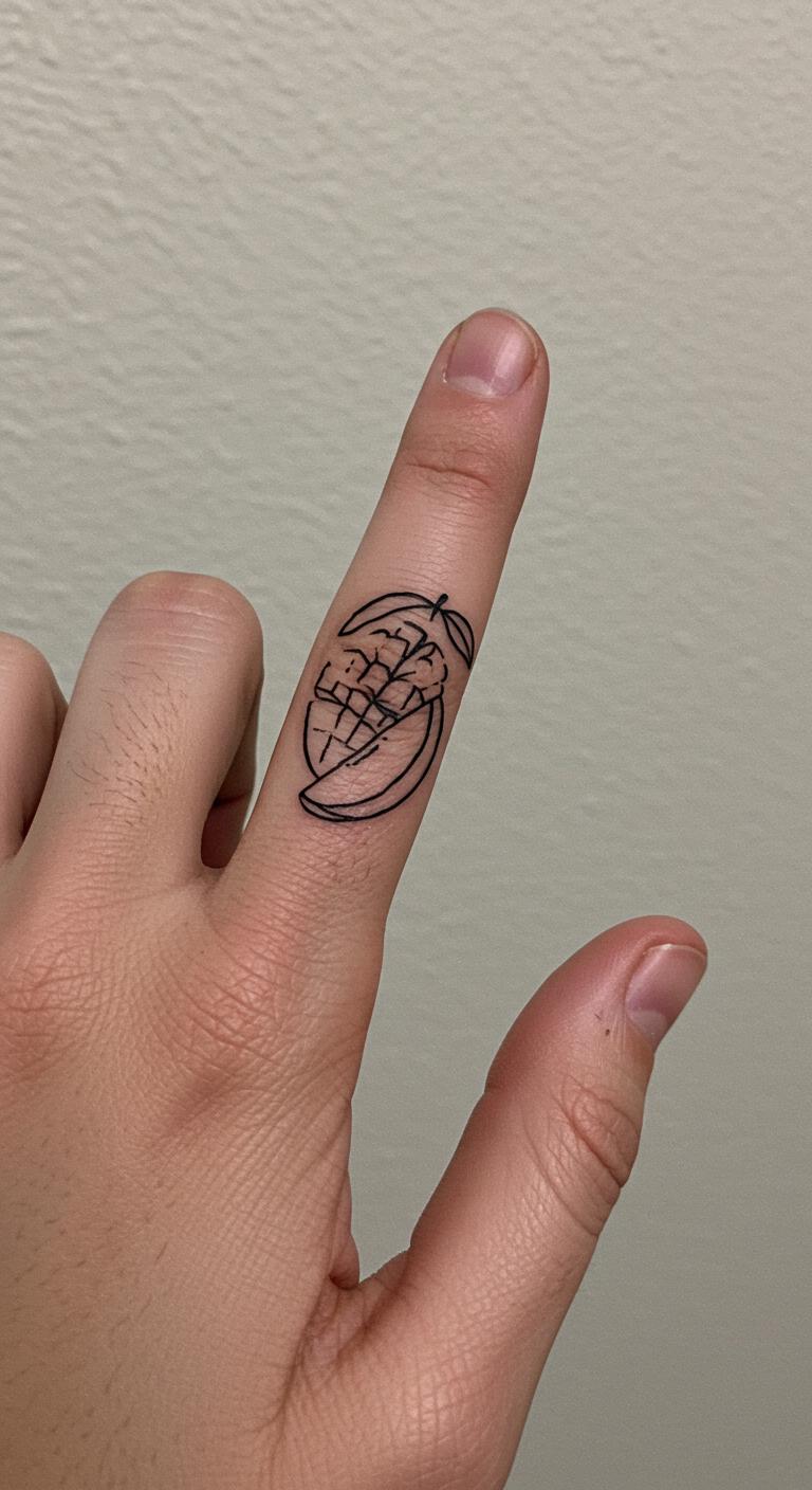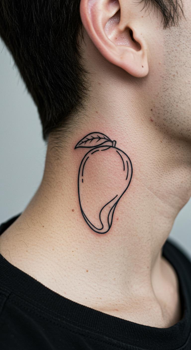 This design keeps things simple with a clean black line of a mango shape. Think one smooth curve for the fruit and a tiny leaf detail.