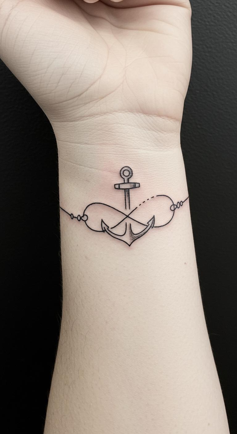Link an anchor to an infinity for lasting strength. Trace both on paper. Connect them smoothly. Wrist works best. Fee is $35. Bold the loop. Use lotion for care. Symbolizes forever. Try a string version.