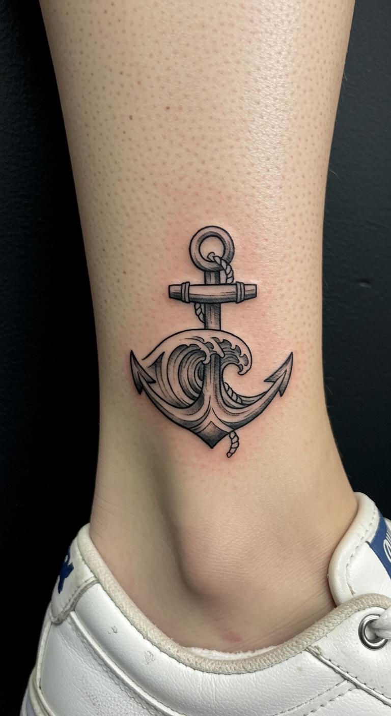 Add waves for a nature vibe. Sketch waves beside the anchor. Use water drawings for ideas. Ankle fits perfectly. Cost is $40. Bold the waves. Moisturize daily. Evokes journeys. Use blue pen for preview.