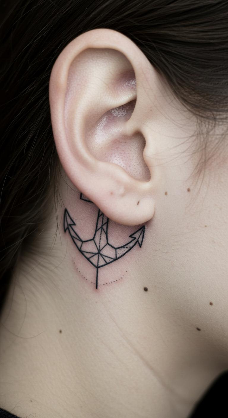 Geometric on ear keeps it subtle. Draw with a fine tool. Ear lobe spot. Costs $25. Add shapes. Care with ear care items. Feels personal. Test with earrings.