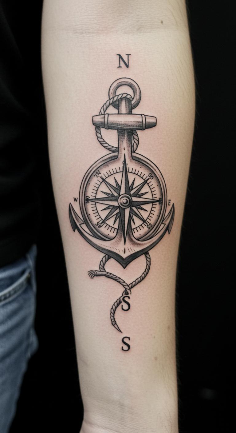 Compass and anchor guide together. Draw both linked. Forearm shows it. Fee $50. Bold directions. Moisturize often. Represents paths. Sketch on map paper.