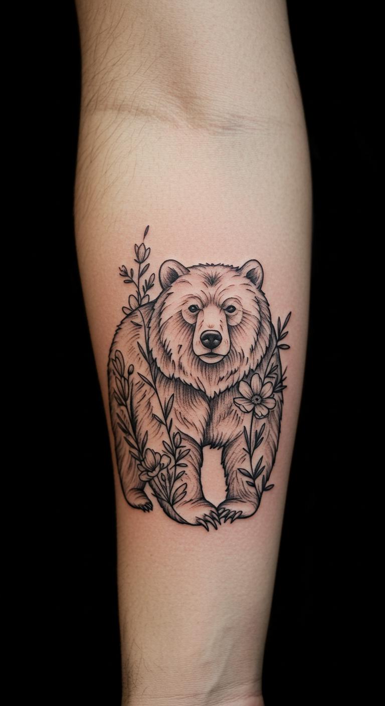 Adding flowers to a bear brings softness, using lines for both elements. Personalize it with your favorite blooms. Draw combinations on paper. Look for sales at tattoo shops. Place on visible arms. Prices around $60 to $130. Use plant-based creams for care. Enjoy it during garden walks. Floral additions soften designs. Create with flower stencils at home.