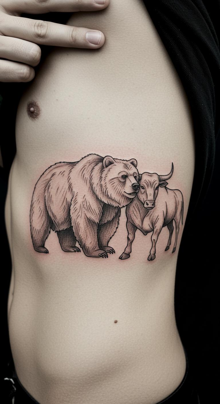 Bear with bull shows duality through paired lines. Brainstorm balances at home. Find duo-specialists cheaply. Side spot for uniqueness. Prices $90 to $180. Care per standard tips. Reflect on life’s ups and downs. Paired tattoos tell tales. Sketch pairs for DIY.