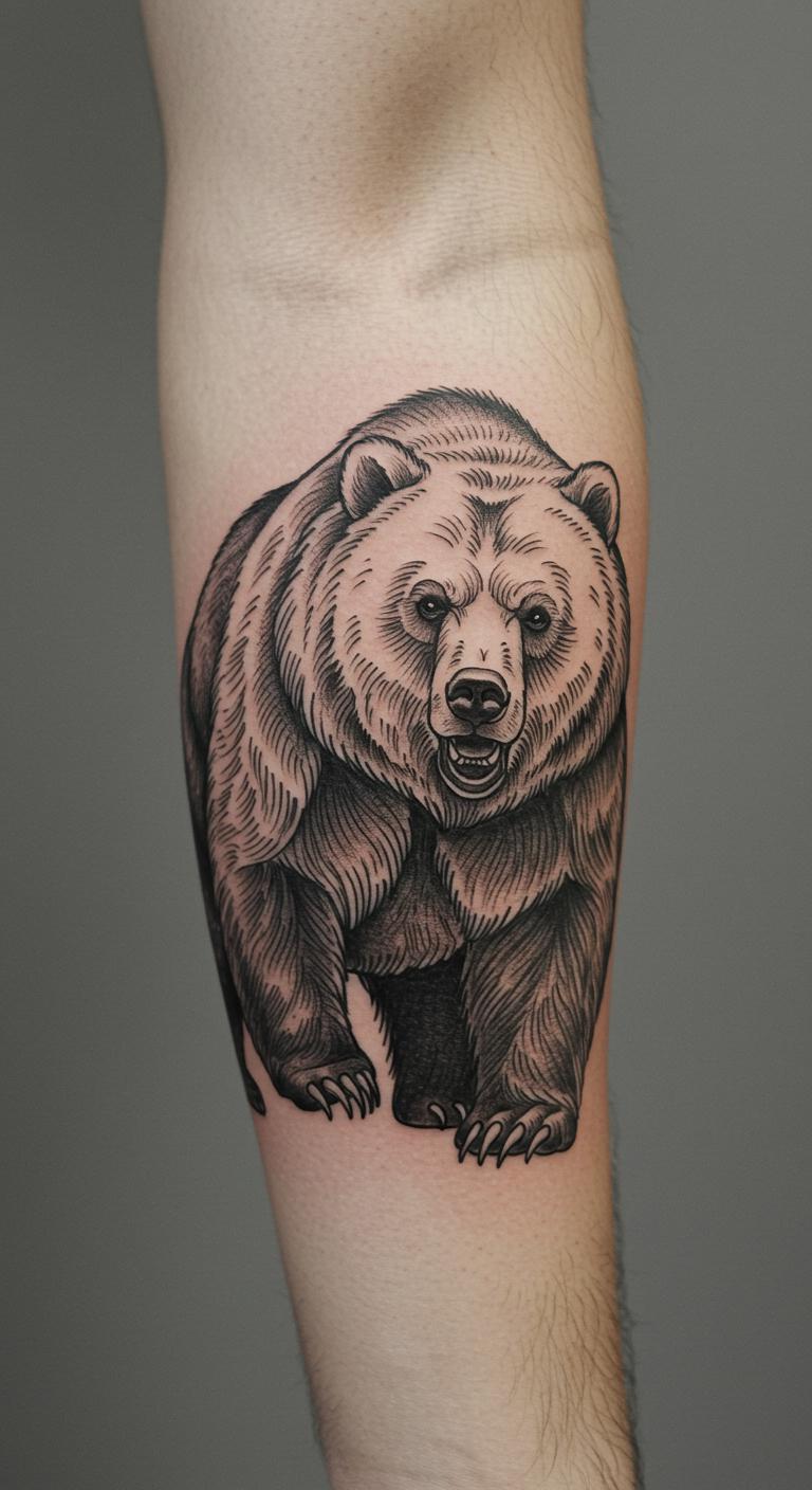 Think of a straightforward bear outline as your go-to for timeless appeal. This design uses just a few lines to sketch a bear’s form, keeping things understated and easy on the eyes. You get the symbol of strength without any fuss. Start with a sketch on paper to visualize it. For a budget tip, use free online tattoo design apps to experiment before visiting a studio. Place it on your wrist for daily visibility. A small version might cost around $50 to $100, depending on your area. Keep aftercare simple: clean with mild soap and cover it initially. Pair this with a nature walk to connect with the bear’s wild spirit. Bold the key: simple lines mean less pain and quicker healing. Try drawing it with a pen on your skin first as a DIY test.