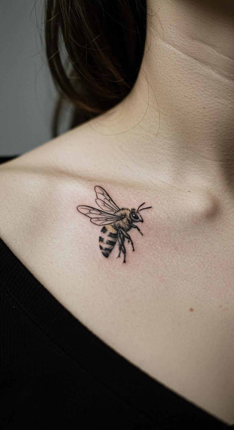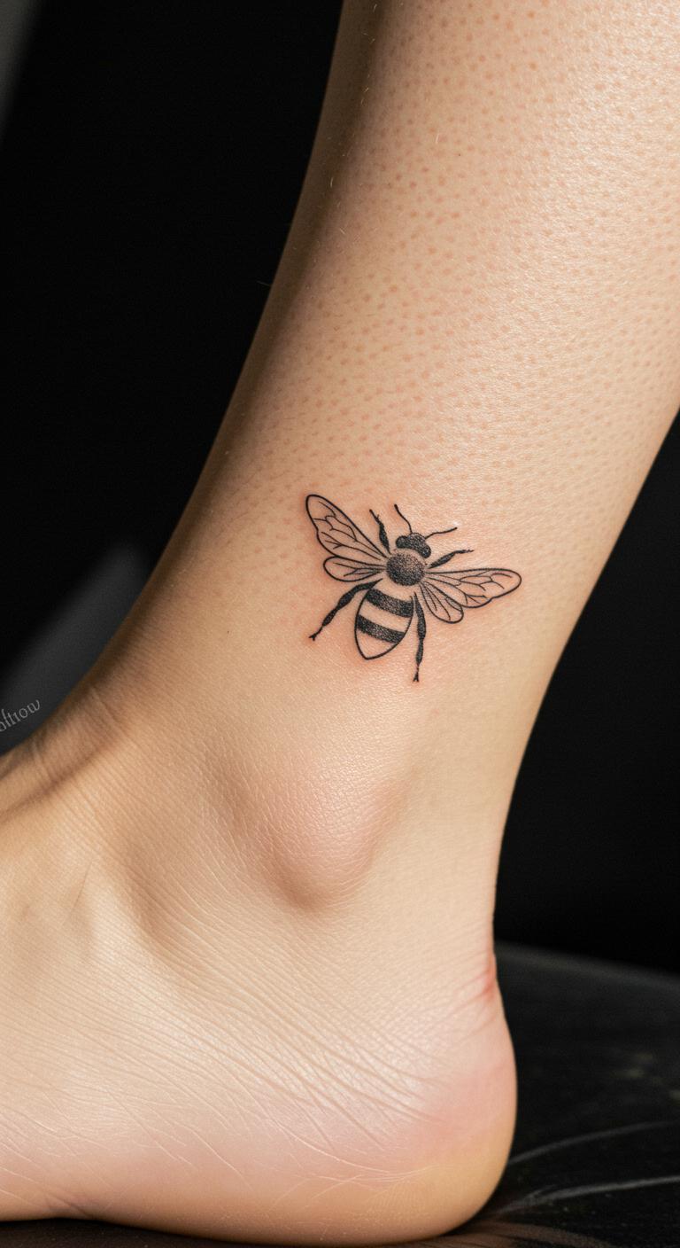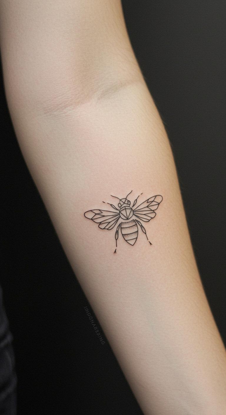 Picture a basic bee outline with just a few strokes. This design uses fine lines to show the bee’s shape. It’s perfect for beginners. You get that elegant look without much detail. Think about placing it on your wrist for easy viewing. Budget tip: Look for local tattoo shops with flash deals under $50. For a DIY feel, sketch the design on paper first with a fine-tip pen. Practice makes it real. Keep aftercare simple with unscented lotion. Bold lines stay crisp longer. This idea works for anyone wanting subtle meaning. Add a personal twist, like a small dot for a favorite spot. It’s quick and painless. Go for it if you love nature vibes.