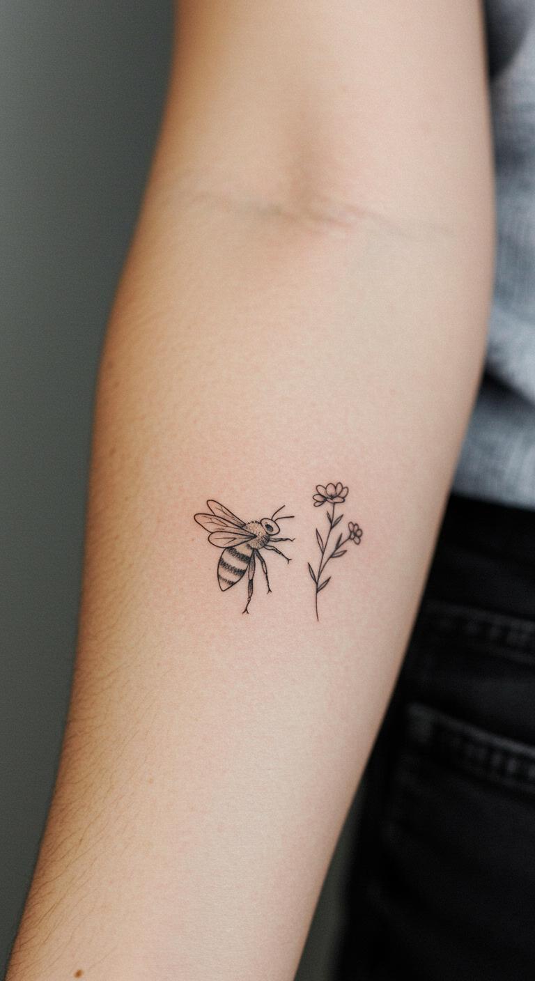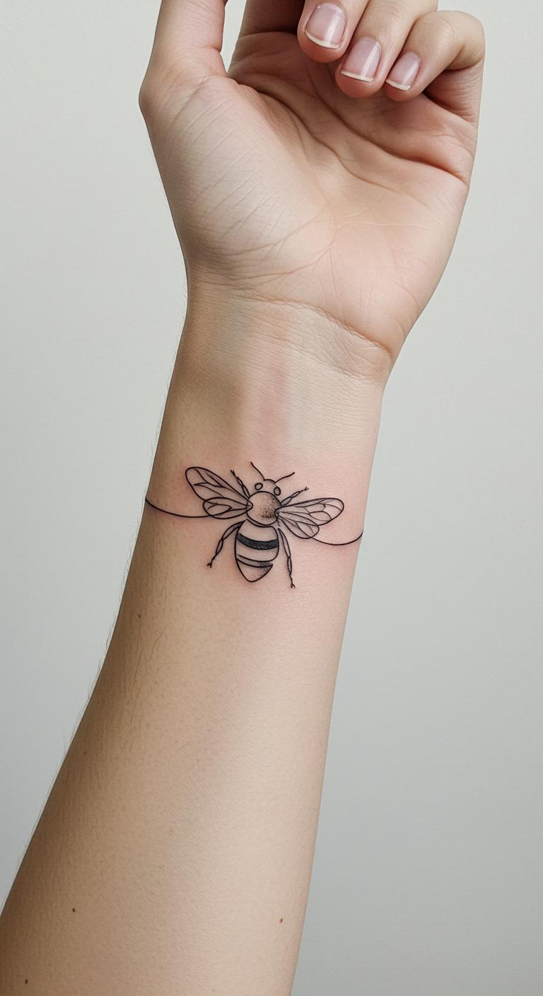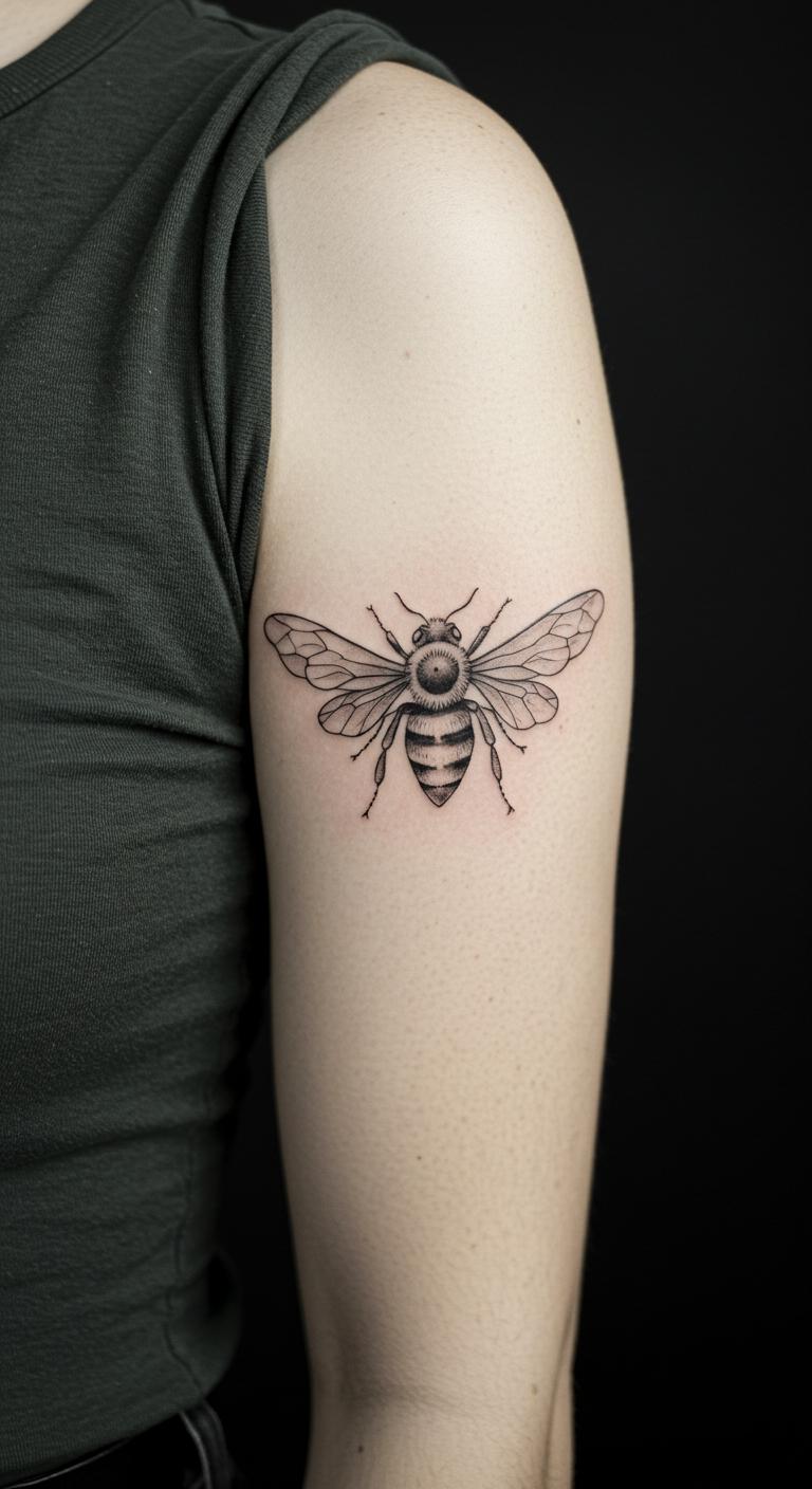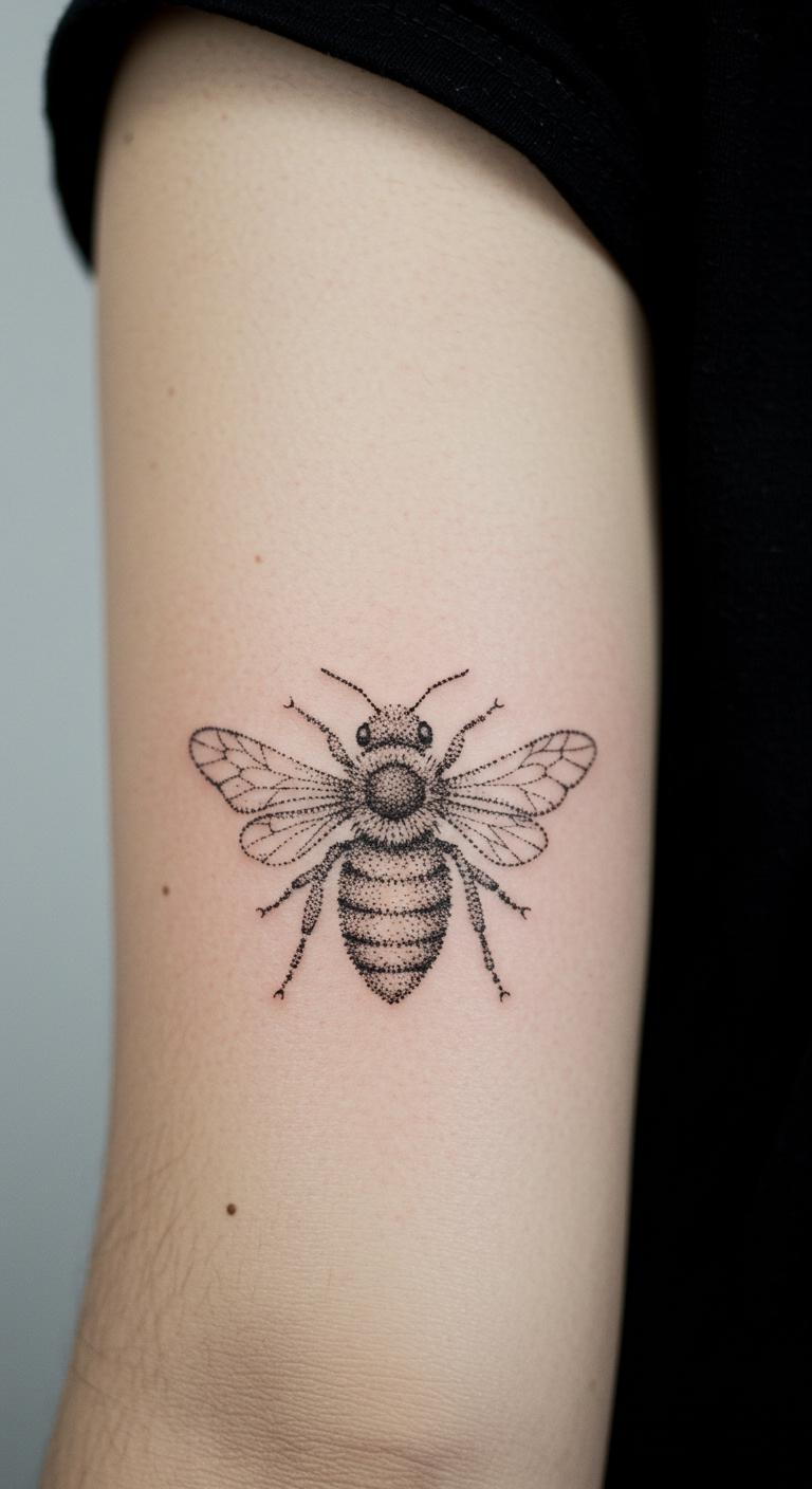 Picture a basic bee outline with just a few strokes. This design uses fine lines to show the bee’s shape. It’s perfect for beginners. You get that elegant look without much detail. Think about placing it on your wrist for easy viewing. Budget tip: Look for local tattoo shops with flash deals under $50. For a DIY feel, sketch the design on paper first with a fine-tip pen. Practice makes it real. Keep aftercare simple with unscented lotion. Bold lines stay crisp longer. This idea works for anyone wanting subtle meaning. Add a personal twist, like a small dot for a favorite spot. It’s quick and painless. Go for it if you love nature vibes.