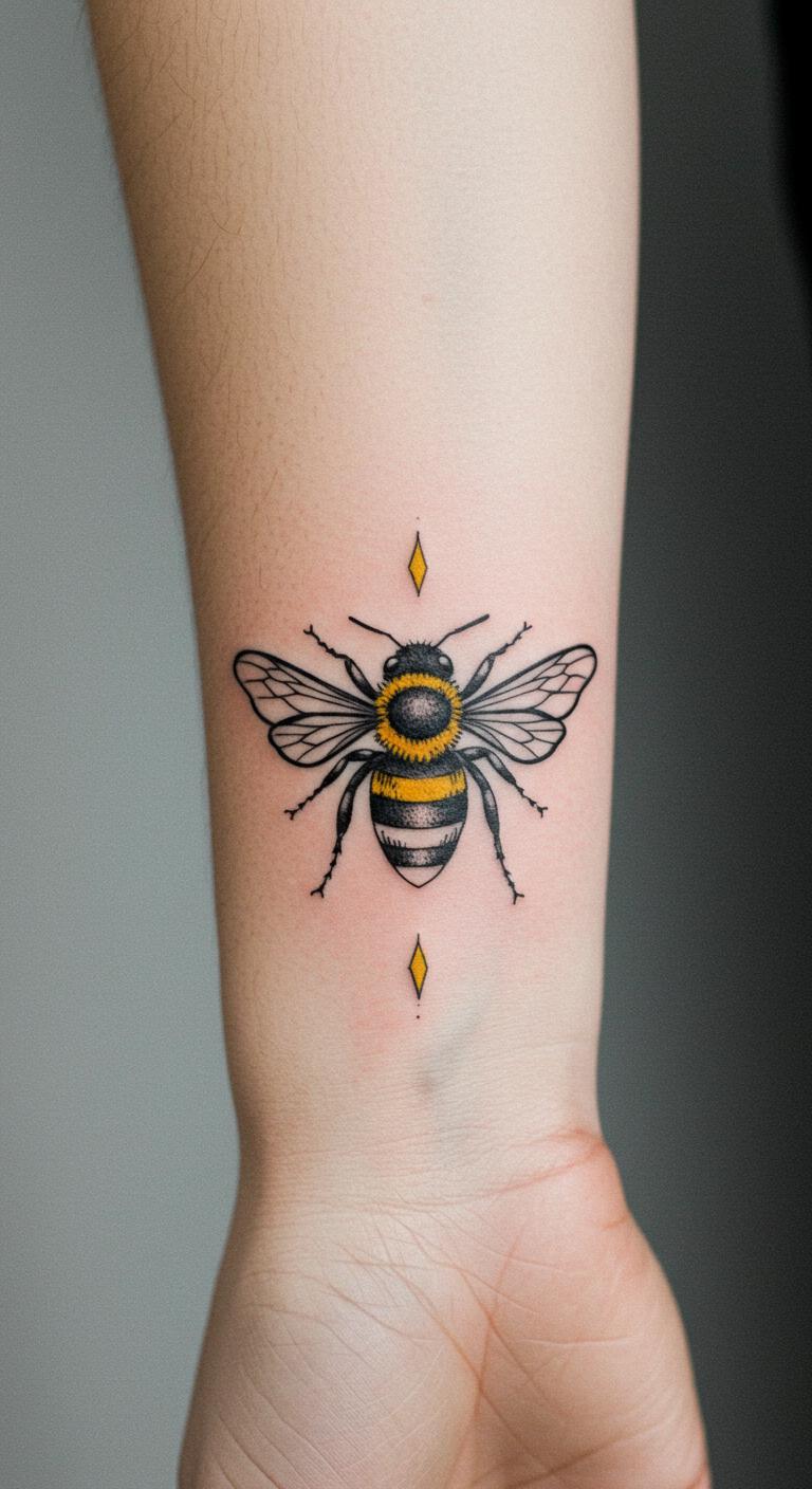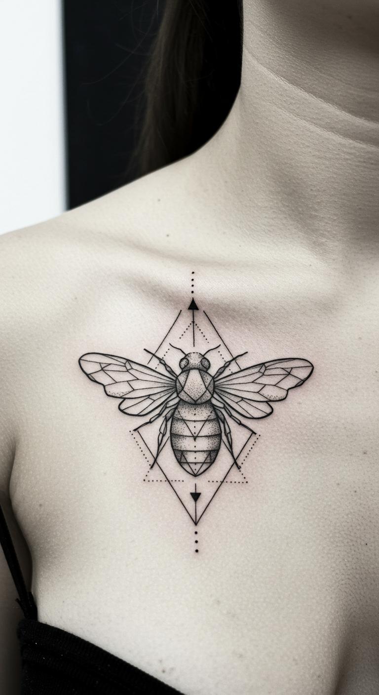 Mix a bee with triangles or circles for a modern edge. The bee’s body becomes part of the shapes. It’s abstract and cool. Place it behind your ear for a hidden gem. This style adds flair without overwhelming. Save money by choosing a smaller size, often $30 to $60 at walk-in studios. DIY example: Use a stencil kit from a craft store to trace on your arm temporarily. Test it out. Simple soap and water keeps it fresh. Focus on the bee’s hard work theme. Make it unique with your birth year inside a shape. It’s versatile for any skin tone. Try this for a fresh take on tradition.