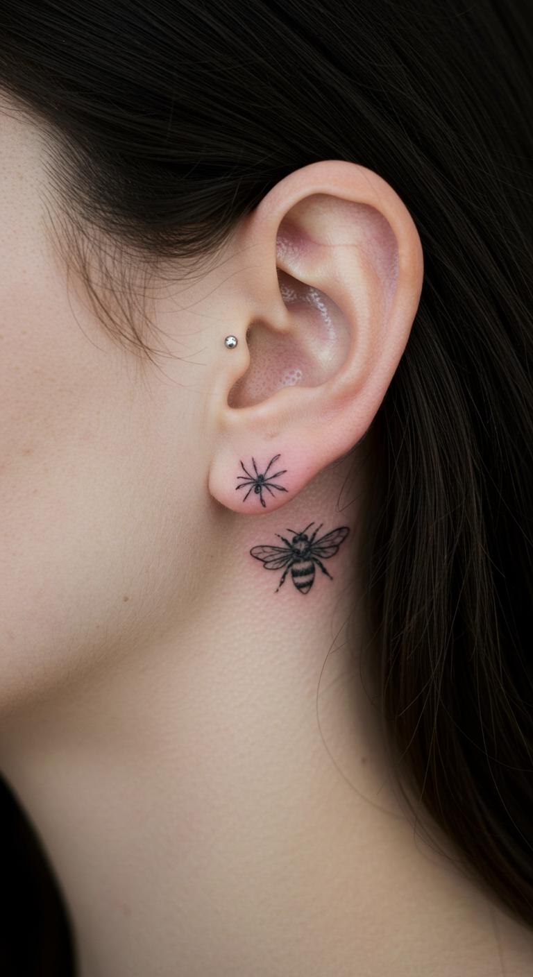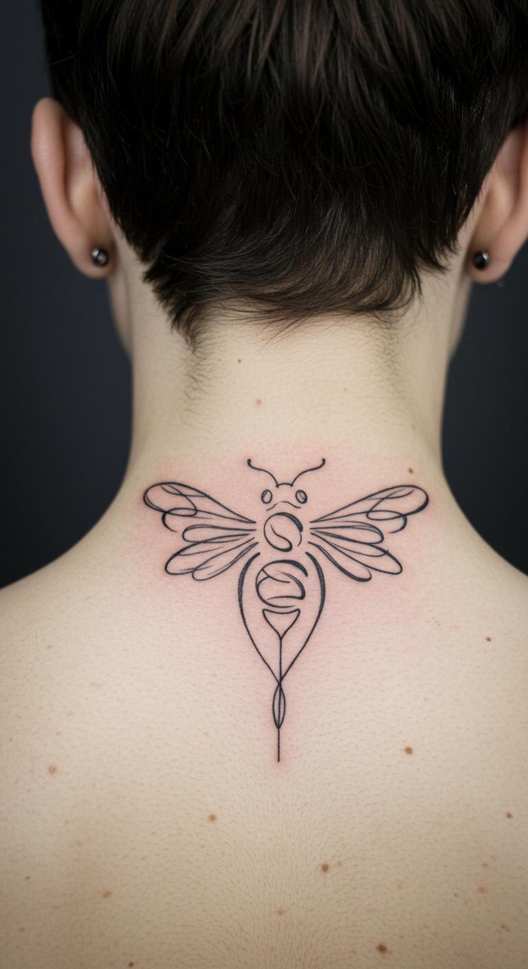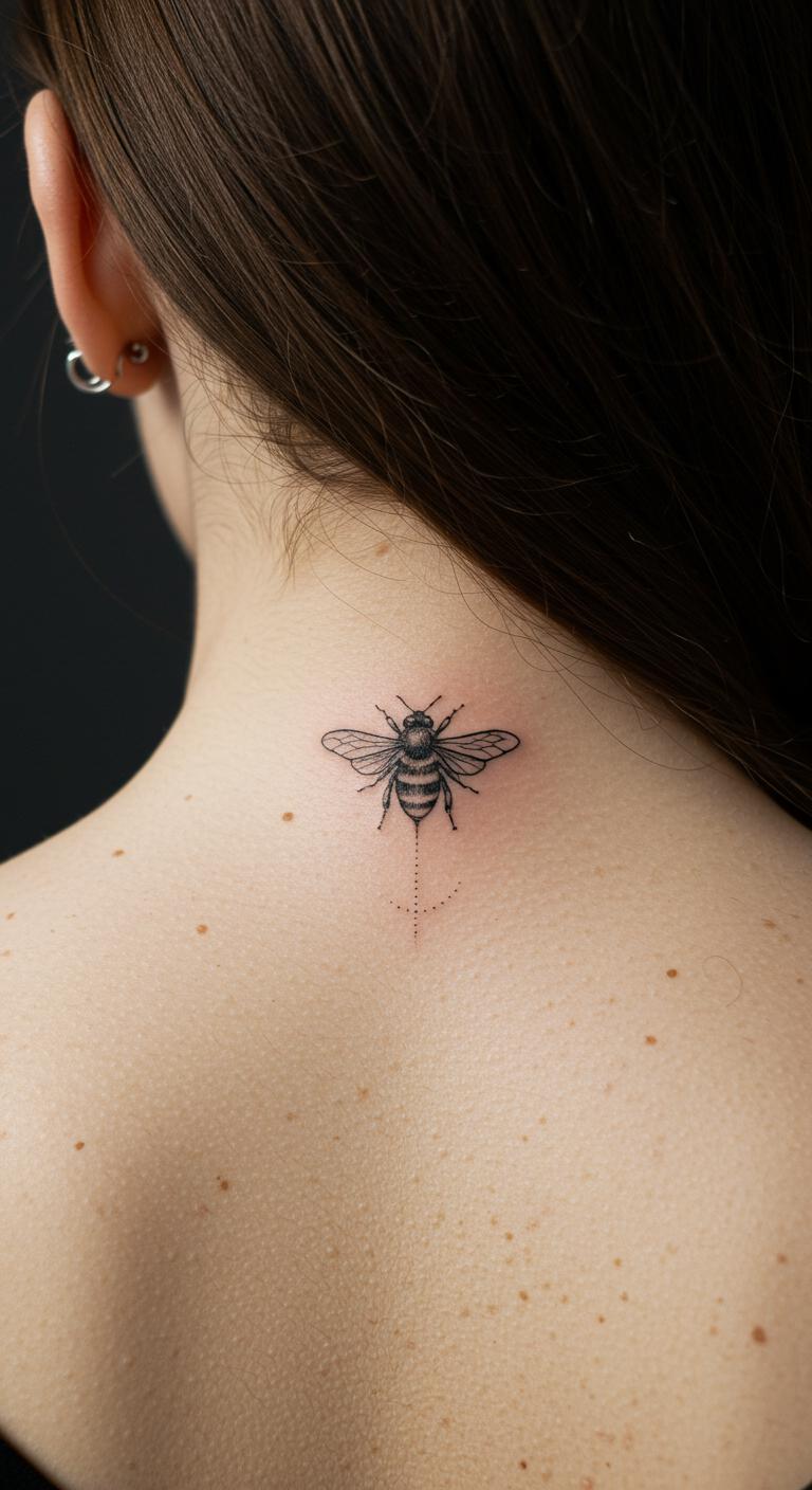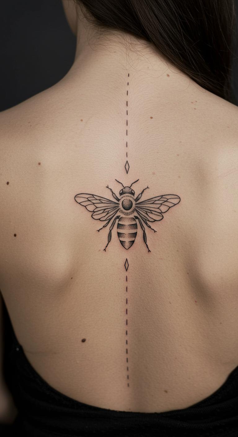 Follow your spine’s curve with the bee. It flows with your body. Great for a bold yet minimal look. Position it along the spine for impact. Keep costs low at $50 tops. DIY: Use body paint to preview on a mirror. Simple setup. Protect with clothing from rubs. Embody loyalty through this. Tailor the length to fit.