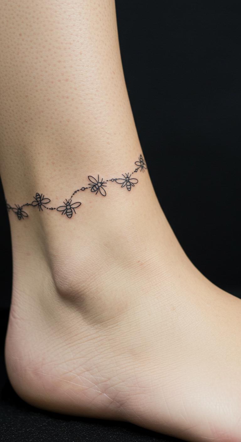 Link multiple bees like a chain. It creates a dainty effect. Put on ankle for flair. This is playful yet minimal. Sessions for $40. DIY: Chain beads on string to mock. Creative. Protect from friction. Symbolize teamwork. Vary the links.