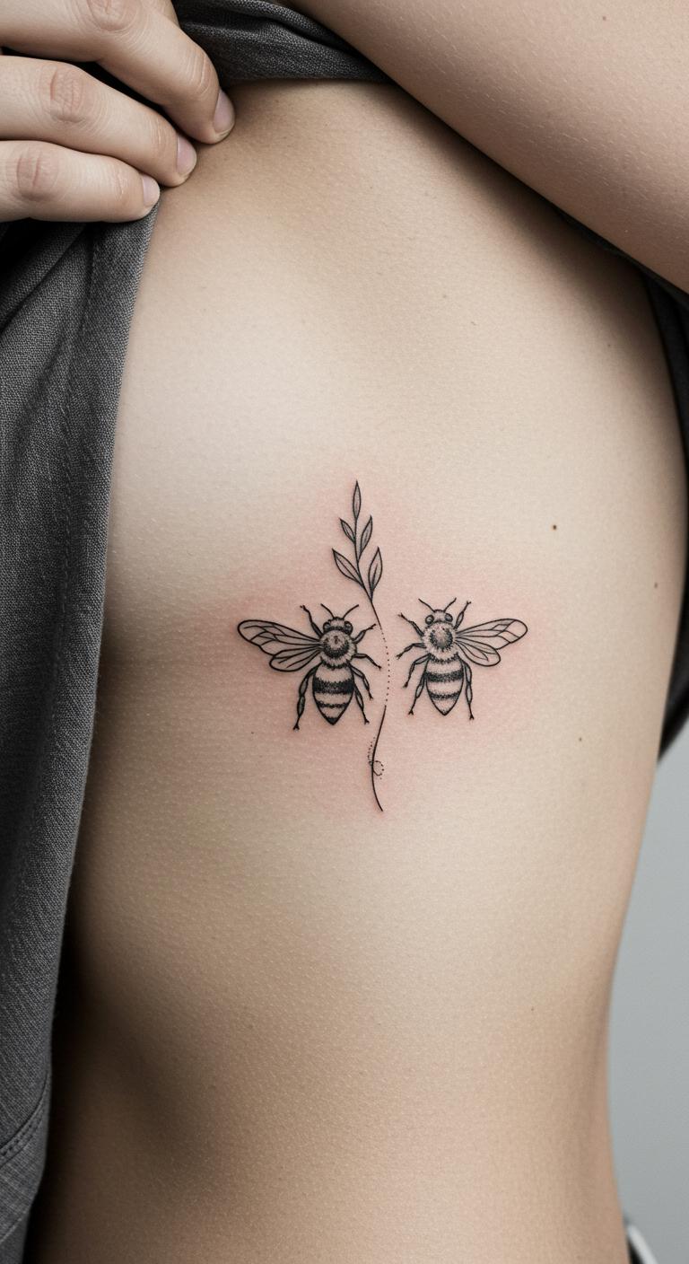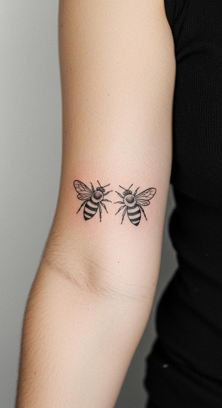 Two bees facing for couples or friends. It shows connection. Place on inner arm. Meaningful and shared. Budget at $40 each. DIY: Draw pairs on friends. Bonding. Maintain symmetry. Represent loyalty. Mirror the bees.
