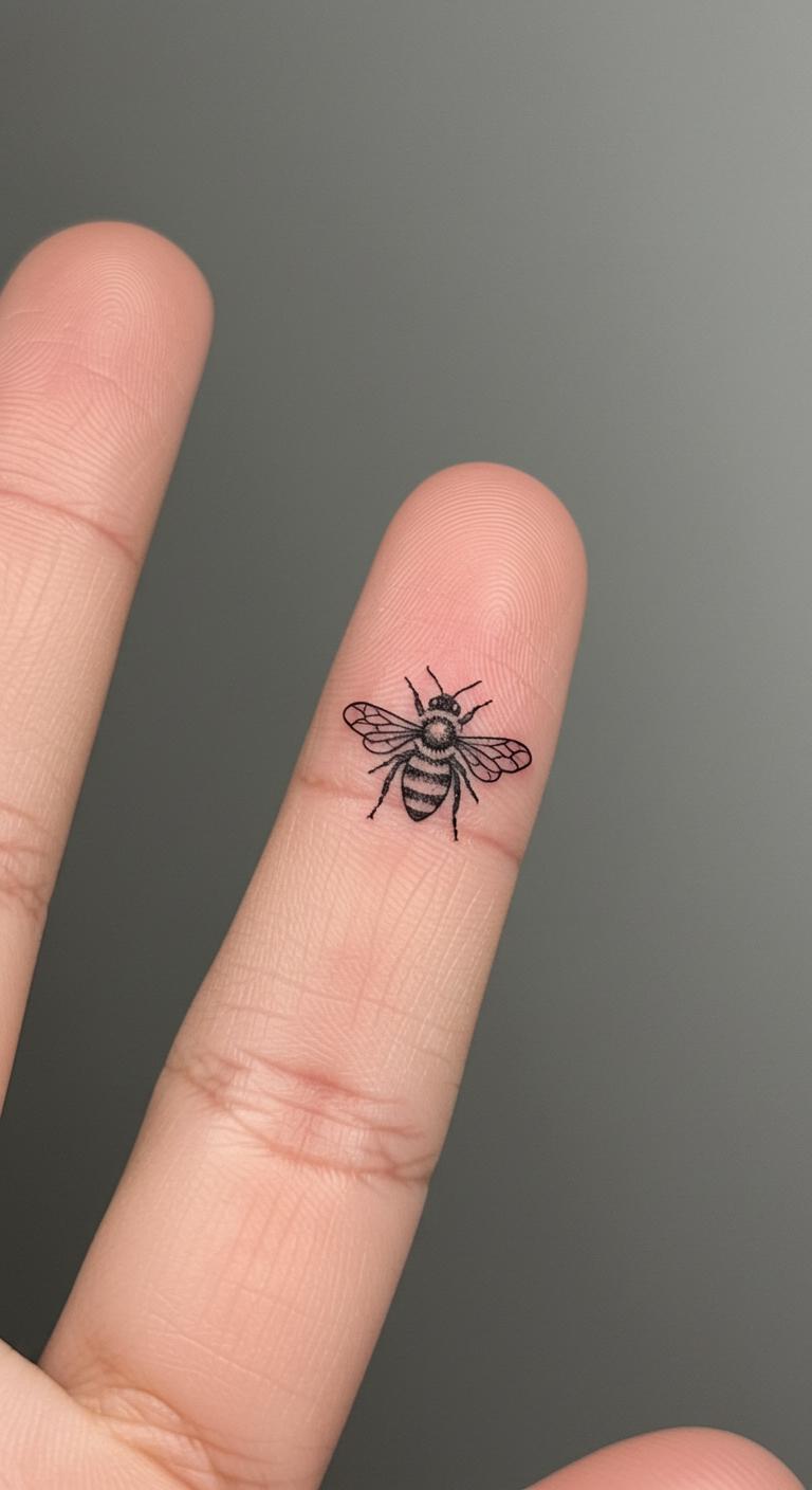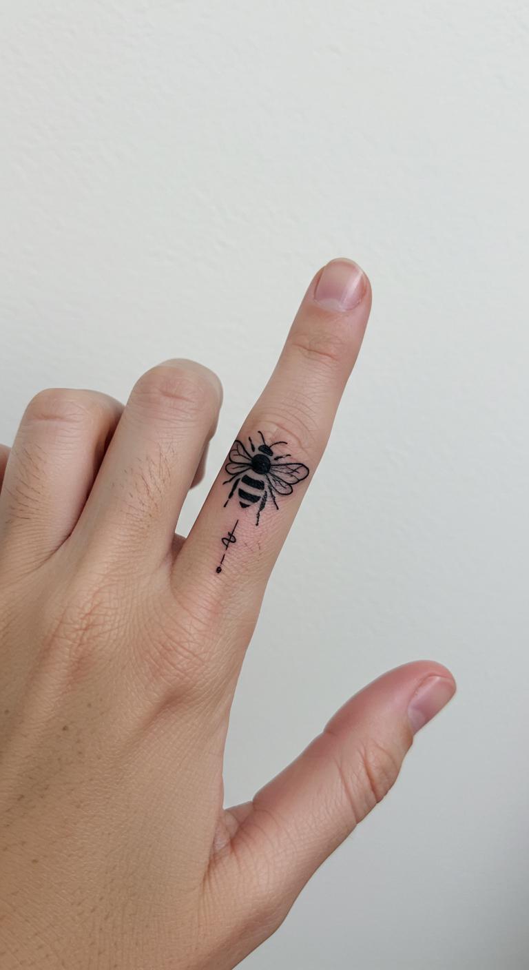 Go super small on your finger. Just a few lines for the bee. It’s discreet and cute. Perfect for everyday wear. Find artists charging $25. DIY: Draw with an eye liner pencil first. Easy test. Avoid water initially. Symbolize hard work small. Adjust for finger width.