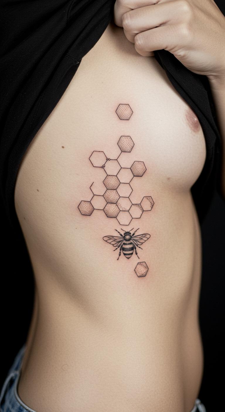 Incorporate small hexagons around the bee. It nods to the hive life. Place on your rib for a personal hideaway. This adds depth affordably. Sessions might cost $40. DIY: Cut shapes from tape for a temporary design. Quick and cheap. Clean with mild soap. Highlight community aspects. Personalize with honeycomb size.