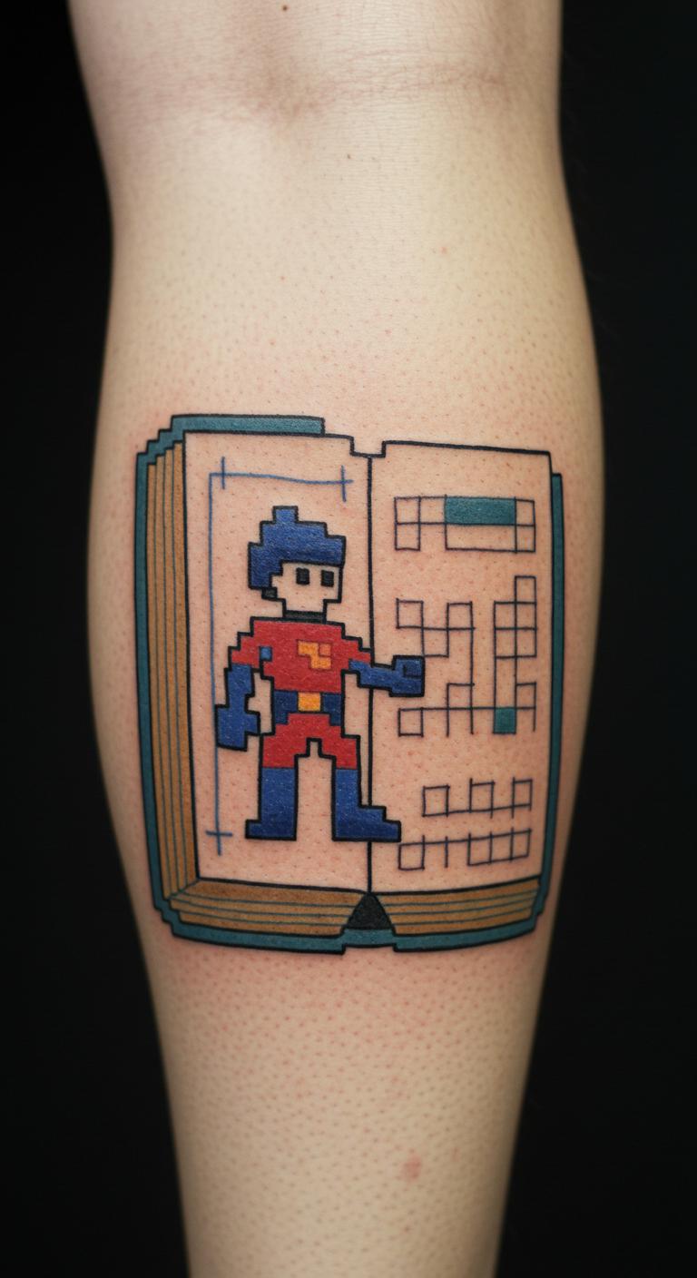 Pixel art turns books digital. It’s a tech nod. Draw pixels on grid paper. Apps create the effect easily. This might cost $55. Calf spot hides or shows as needed. Pixels heal like any small ink. Use phone filters for previews. This tattoo pixels your passion.