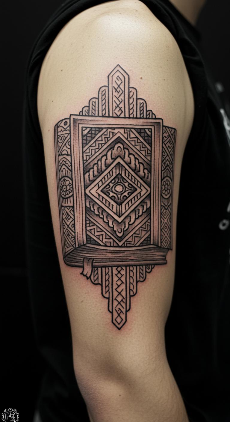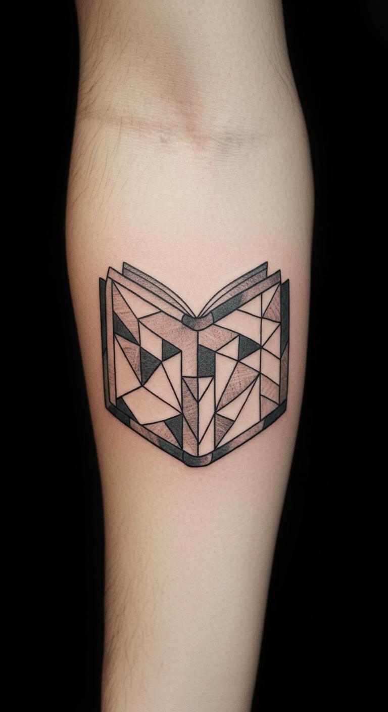 Geometric shapes build a book form. It’s abstract yet clear. Draw triangles on paper to start. Apps help align the patterns. Shops offer this for about $55. Arm spot lets you display it. The design is minimal, so healing is easy. Temporary options let you experiment cheap. This tattoo adds edge to your look.