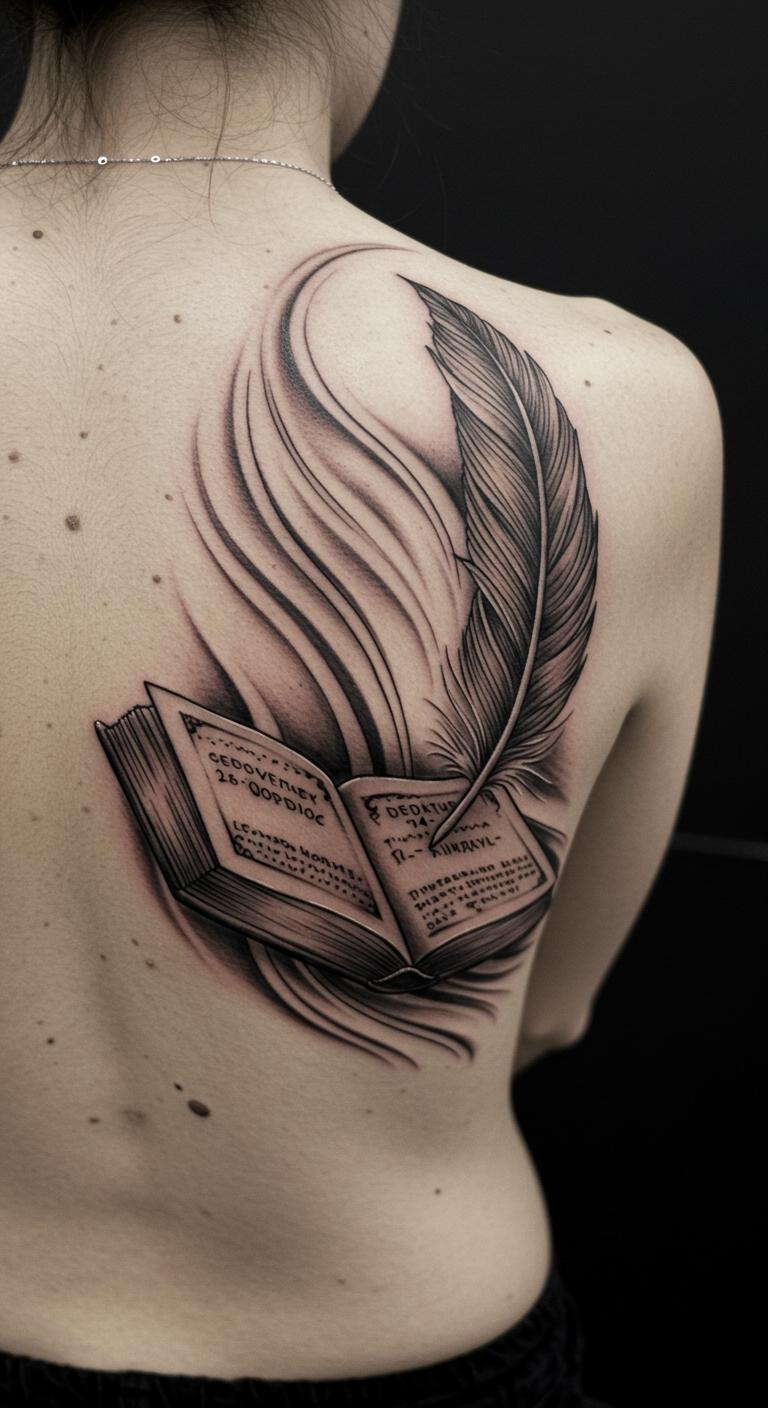 A feather with a book suggests freedom. Keep it light and airy. Draw the feather beside the book. Apps help with flow. This costs about $50. Back spot offers privacy. The design heals smoothly. Temporary options are easy on the wallet. This tattoo lifts your spirit.