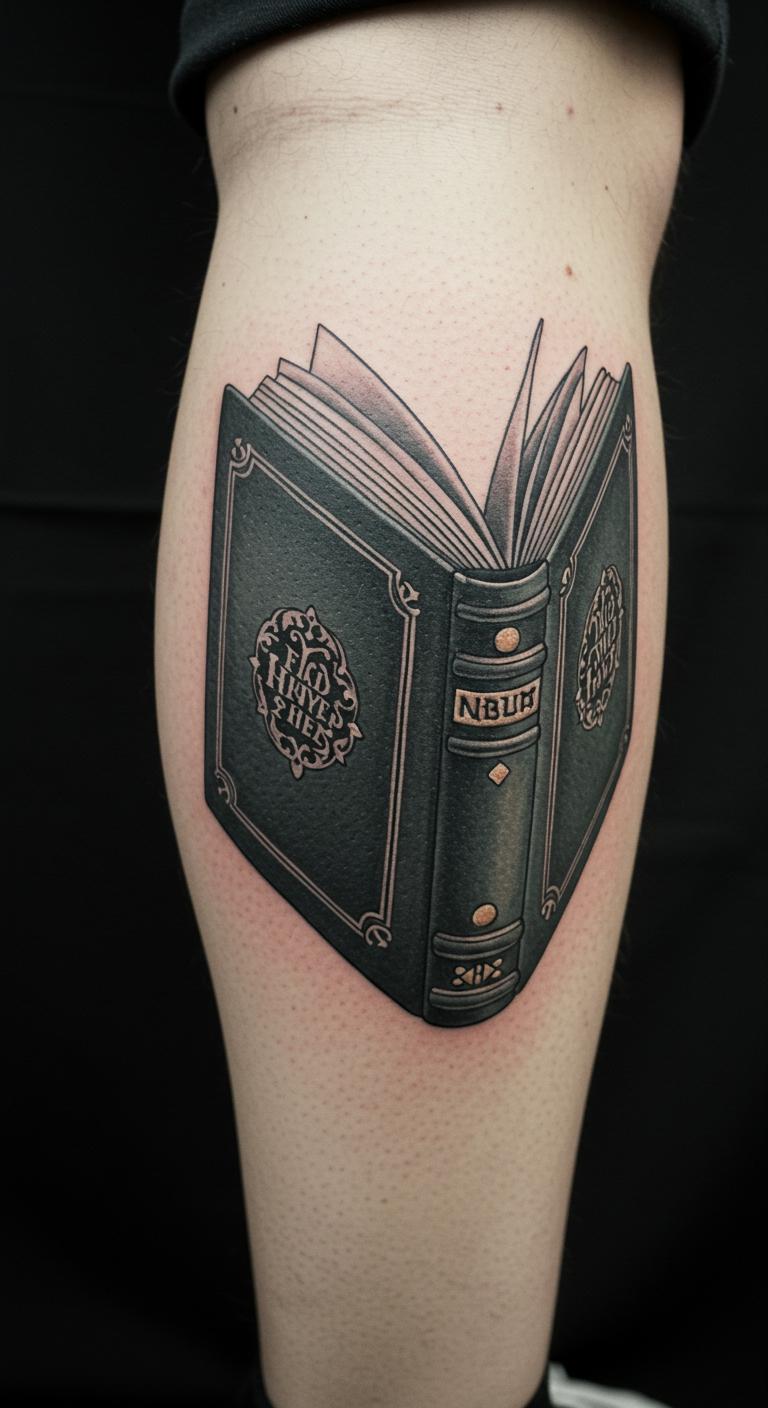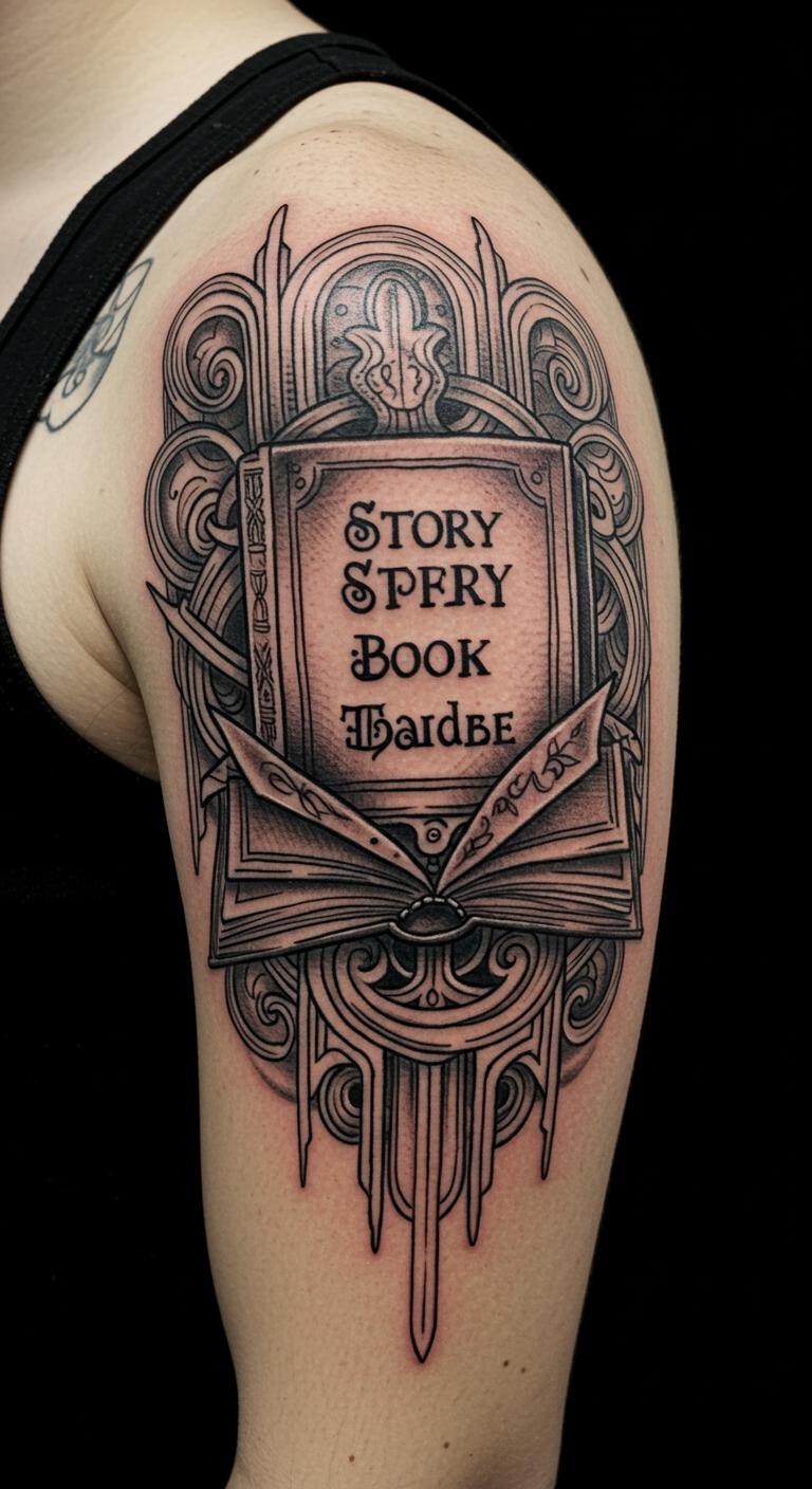 Make a book tattoo your own story. Add custom touches. Draw your elements first. Apps customize freely. This might run $75. Shoulder spot personalizes it. Story details heal meaningfully. Temporary custom designs cost little. This tattoo stories your life.