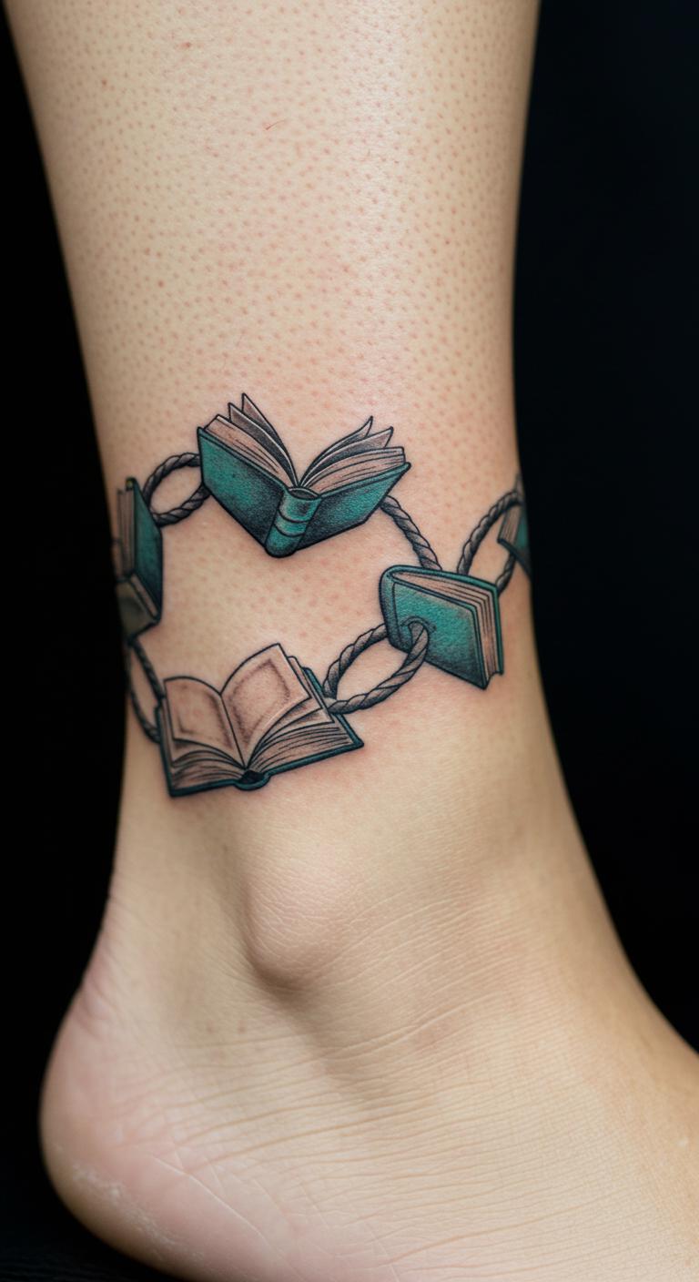 Chain books around your ankle. It’s linked and fun. Sketch chains of books. Apps chain them together. This costs $60. Ankle placement secures it. The chain heals linked. Temporary chains test affordably. This tattoo chains your reads.