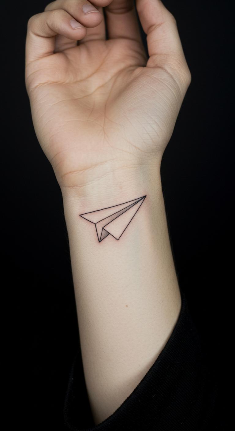 A paper airplane from a book stands for escape. Keep the lines sharp and fun. Sketch it freehand at home. Digital tools refine the fold. Expect $45 for this simple ink. Wrist placement makes it personal. It heals without much hassle. Use stickers to try first. This design flies with your imagination.