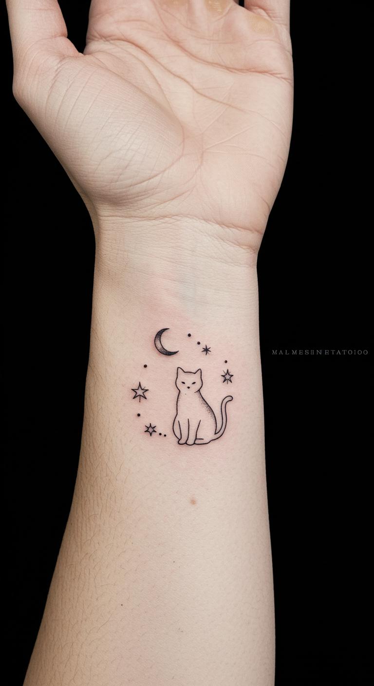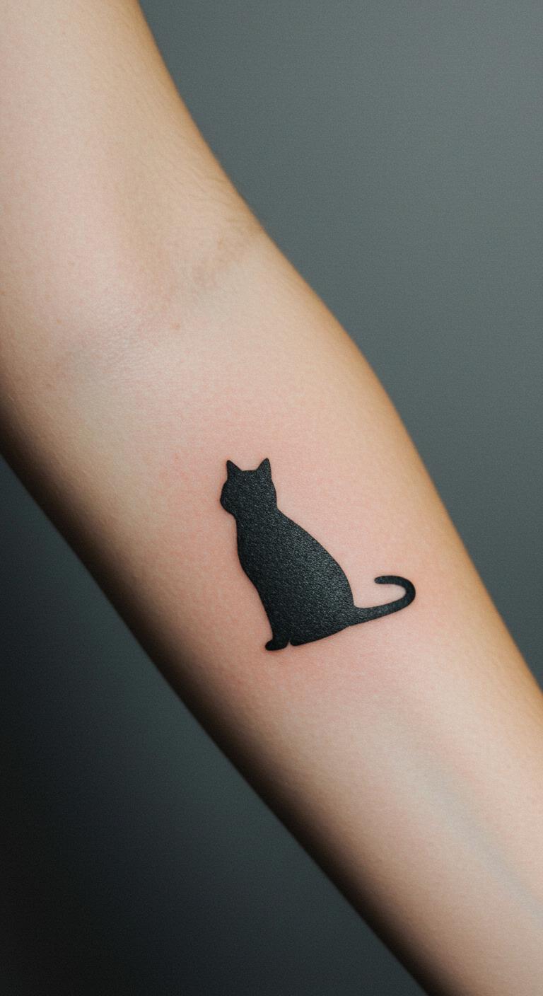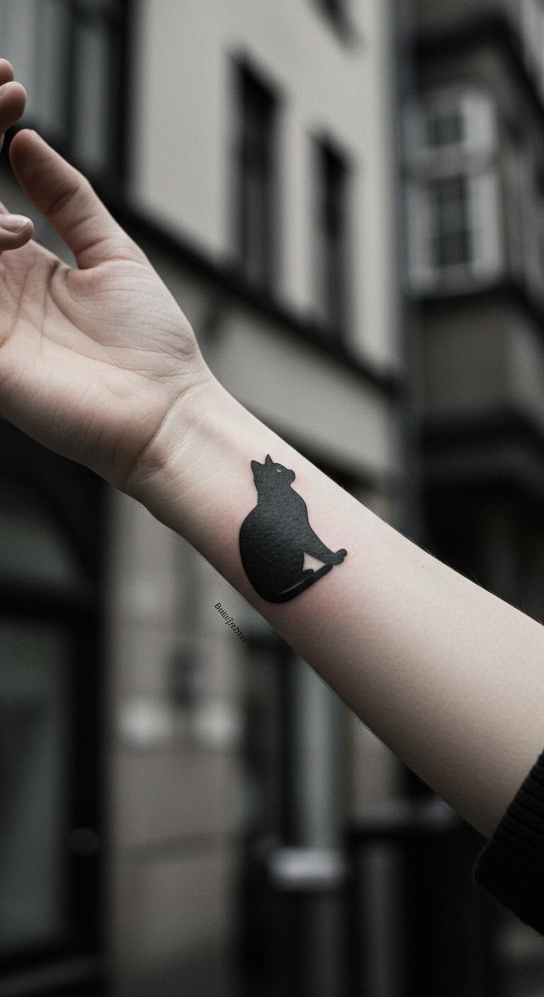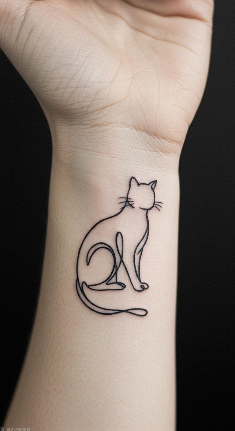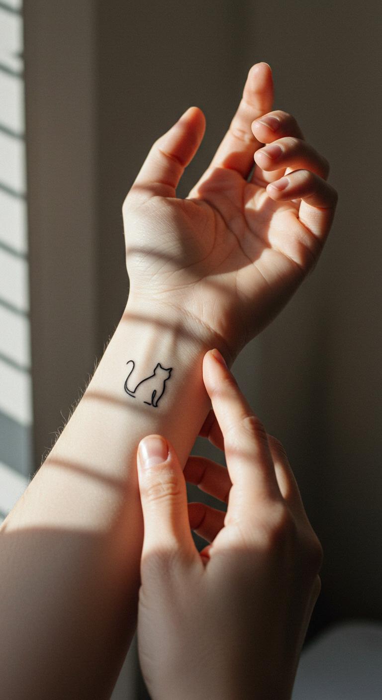 Wrist tattoos remain a favorite for small, meaningful designs. Minimalist cats fit perfectly here, allowing you to see and show off your tattoo easily. The wrist’s natural curves enhance simple outlines or small silhouettes. Because of the small size, these tattoos cost less and heal quickly. For a personal approach, choose a design small enough to peek from under sleeves, making it both subtle and accessible.