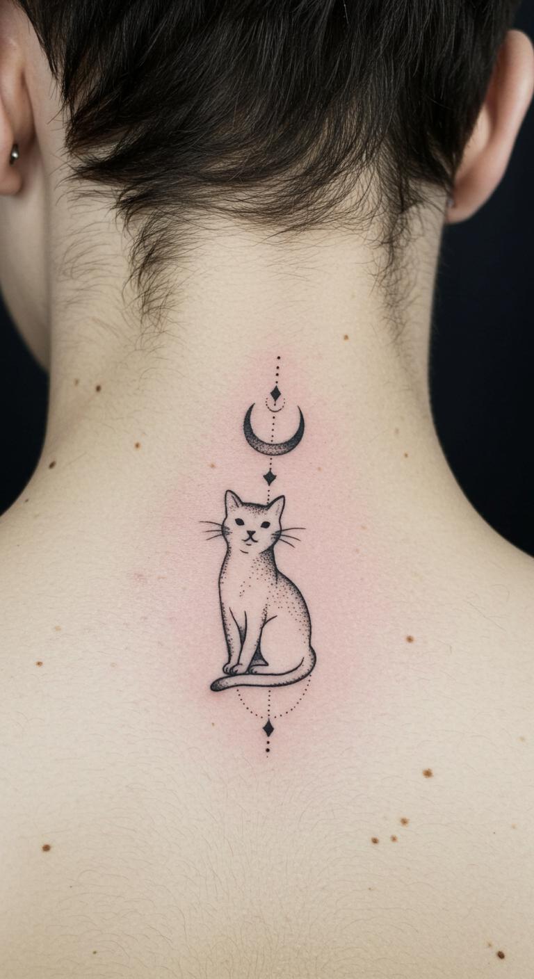 Black cats carry a mysterious aura. Their symbolism mixes good luck with witchy charm. Adding celestial elements like moons or stars enhances this magical feel. Place this tattoo behind the ear or on the shoulder for a discreet yet meaningful spot. If you’re on a budget, look for artists who specialize in fine line work—it tends to last while keeping details delicate. This style suits those who enjoy spiritual or mystical themes without complexity.