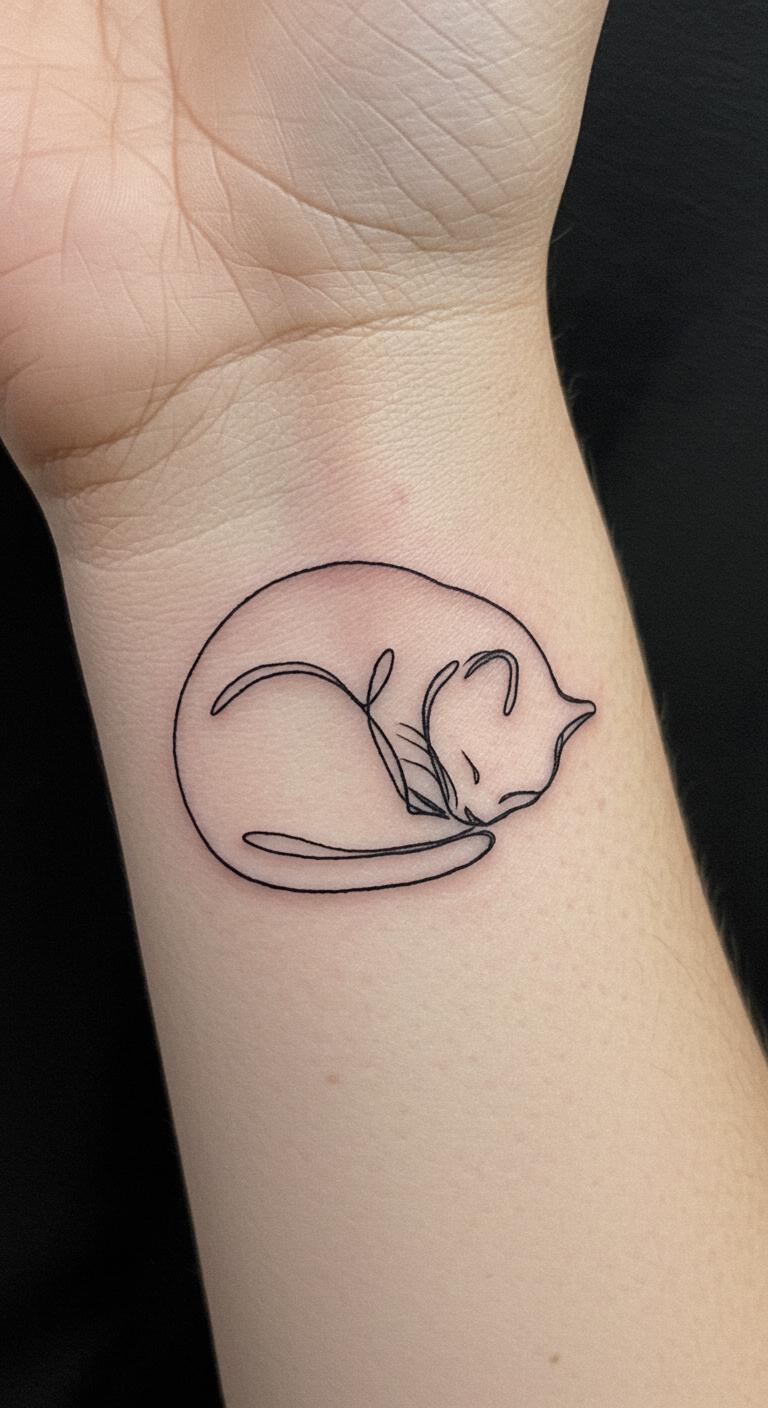 A curled sleeping cat symbolizes peace and comfort. Minimalist versions use smooth, flowing lines to capture this restful pose. It’s a calming image perfect for those seeking a tattoo that brings tranquility. The design suits small placements and is quick to ink, saving money. Sketch your cat sleeping comfortably to inspire a personal shape. This choice works well for anyone wanting a quiet joy symbol.