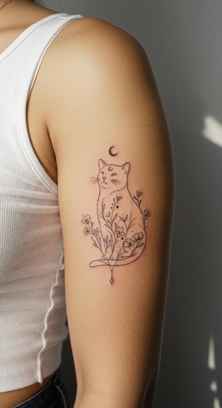 Mixing flowers with stars or moons brings softness and magic to a cat tattoo. Minimal lines keep the look simple but meaningful. Such combos are easy on budgets by choosing small, simple flowers and shapes. Experiment with favorite blossoms and celestial symbols to personalize your design. This blend appeals to people who value nature and spirituality alongside their love for cats.