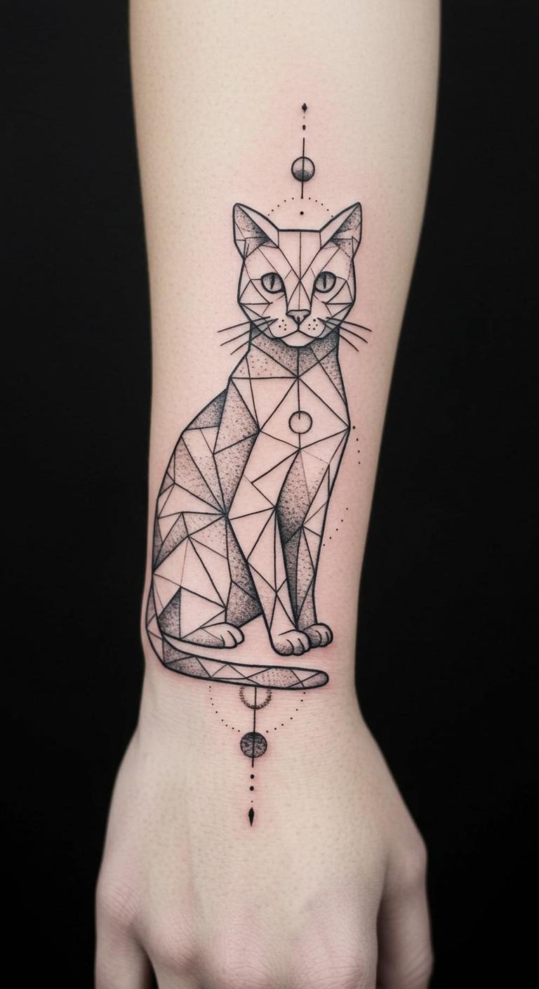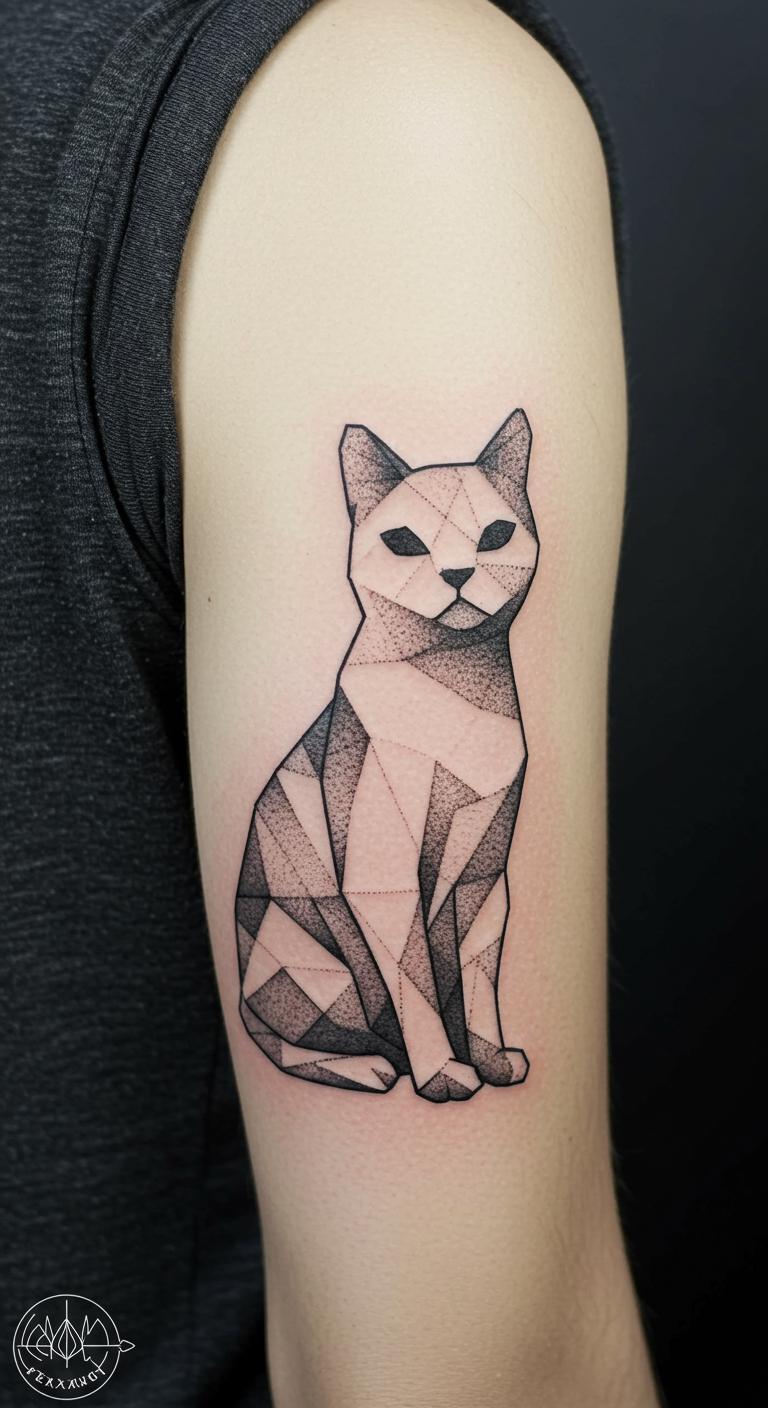 Abstract and geometric shapes create modern takes on cat tattoos. Triangles, circles, and lines build minimalist feline forms in fresh ways. These designs thrive on clarity, so simple shapes work best. They also fit small sizes and are quick to ink, saving money. For a DIY fun fact, experiment with geometric sketches to visualize your cat uniquely. This style appeals to those who like artful, simplified expressions.