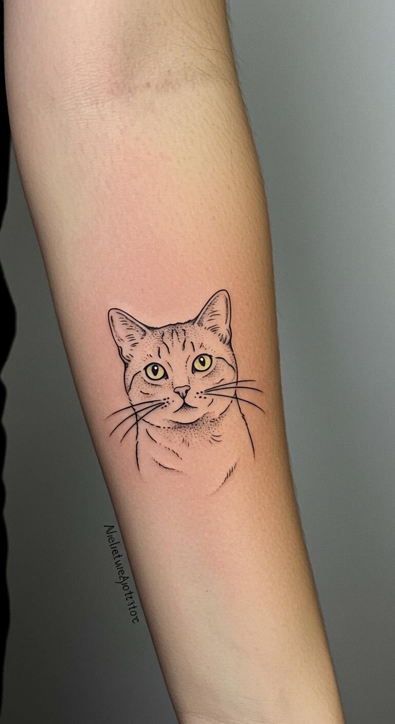 Adding tiny whiskers to a cat tattoo boosts its charm without complicating the design. Whiskers convey personality and cuteness on a small scale. They fit nicely with simple line art faces or full outlines. This small detail can make your tattoo feel more lively and personal. Consider a compact design for the wrist or finger. For those who like DIY options, sketch your pet’s whisker pattern and show it to your artist as a custom detail.