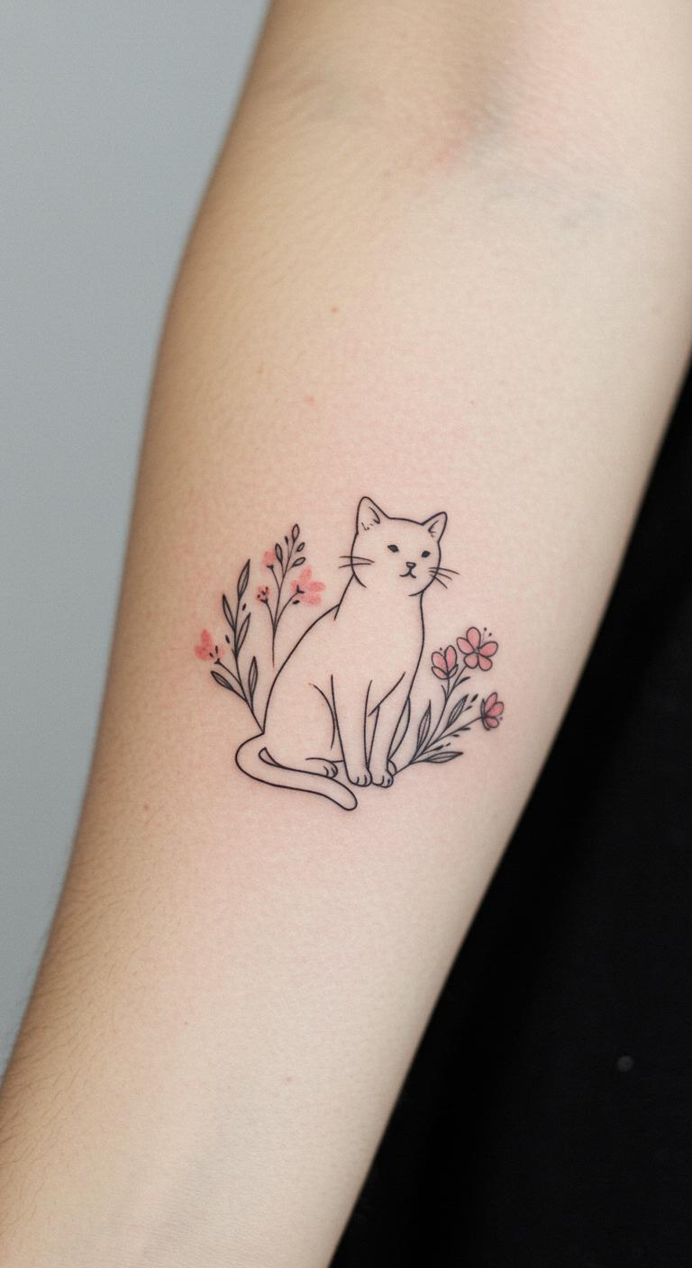 Soft floral elements give your cat tattoo a natural, gentle touch. Flowers contrast with clean cat outlines, making a balanced design. Among budget tips: choose smaller flowers like daisies or lavender for easier, affordable tattoo time. These pieces suit anyone who loves nature without overwhelming the tattoo’s minimalist heart. You can even pair it with a personal favorite flower for added meaning.