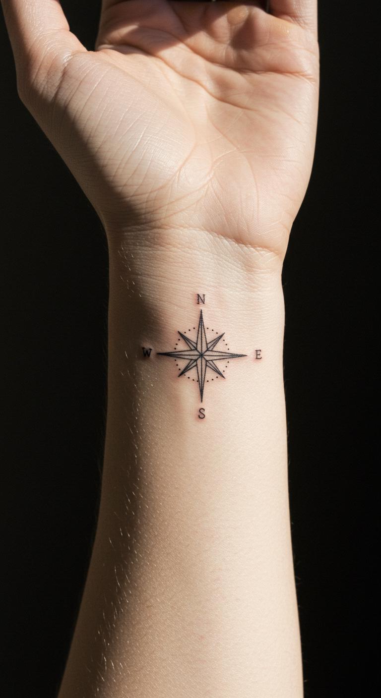 Picture a small compass on your wrist for everyday guidance. This design uses just a few fine lines to form a circle with points. Easy to cover at work, it fits under a watch. Start by sketching the shape on paper with a pen to see how it looks. Keep costs low—many artists charge $50 to $100 for something this size. Go to a local shop during off-peak hours for deals. Add a personal twist, like making one point bolder. This spot heals fast, usually in two weeks. Try drawing it with henna first to test the feel. Keep it black ink for that timeless look.
