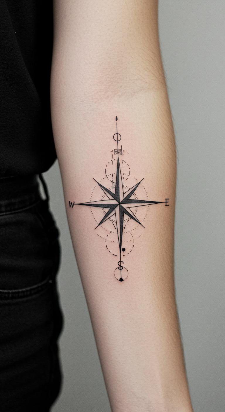 Go for shapes that play with angles in a geometric compass. Thin lines create triangles inside a circle for a modern edge. Draw it on your arm with a marker before deciding. Artists often price these at $60 for small versions. Look for studios with flash deals online to save money. Pair it with a simple dot for extra flair. This style suits first-timers since it takes less time. Practice freehand sketches at home for ideas. Focus on placement like the forearm for easy viewing.