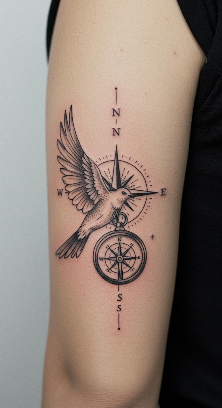 Incorporate a bird flying from your compass for freedom feels. Light lines tie it together. Draw the bird next to the compass on paper. Plan for $90. Watch for seasonal discounts. Keep the bird profile simple. Upper arms hide under shirts. Use bird stamps for home ideas. This design sparks travel dreams.