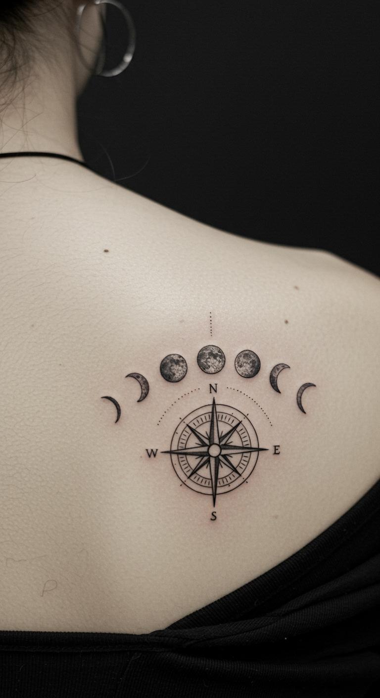 Pair moon phases with your compass for night wanderlust. Simple curves blend in. Sketch phases around the compass. Expect $70. Search online for artist portfolios with prices. Keep moons as half-circles. Shoulder blades recover quickly. Use moon stencils for home prep. It ties to lunar adventures.