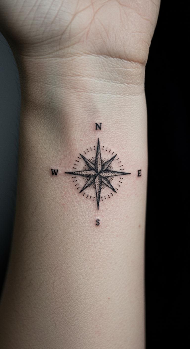 Use dots to form your compass for a textured look. Dots create the points subtly. Practice dot patterns on paper. Costs start at $50. Look for walk-in options. Space dots evenly for clarity. Wrists heal fast. Try dot art with a pen at home. This adds depth to your ink.