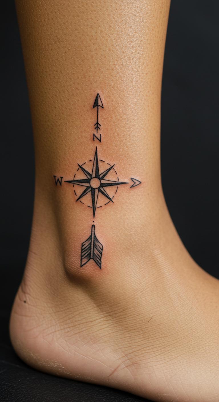 Shape your compass like an arrow for forward motion. Sharp lines make it pop. Draw arrows pointing out on paper. Budget $60. Check for flash tattoos. Extend one line longer. Ankles mend in two weeks. Sketch with straight edges at home. It points to new horizons.