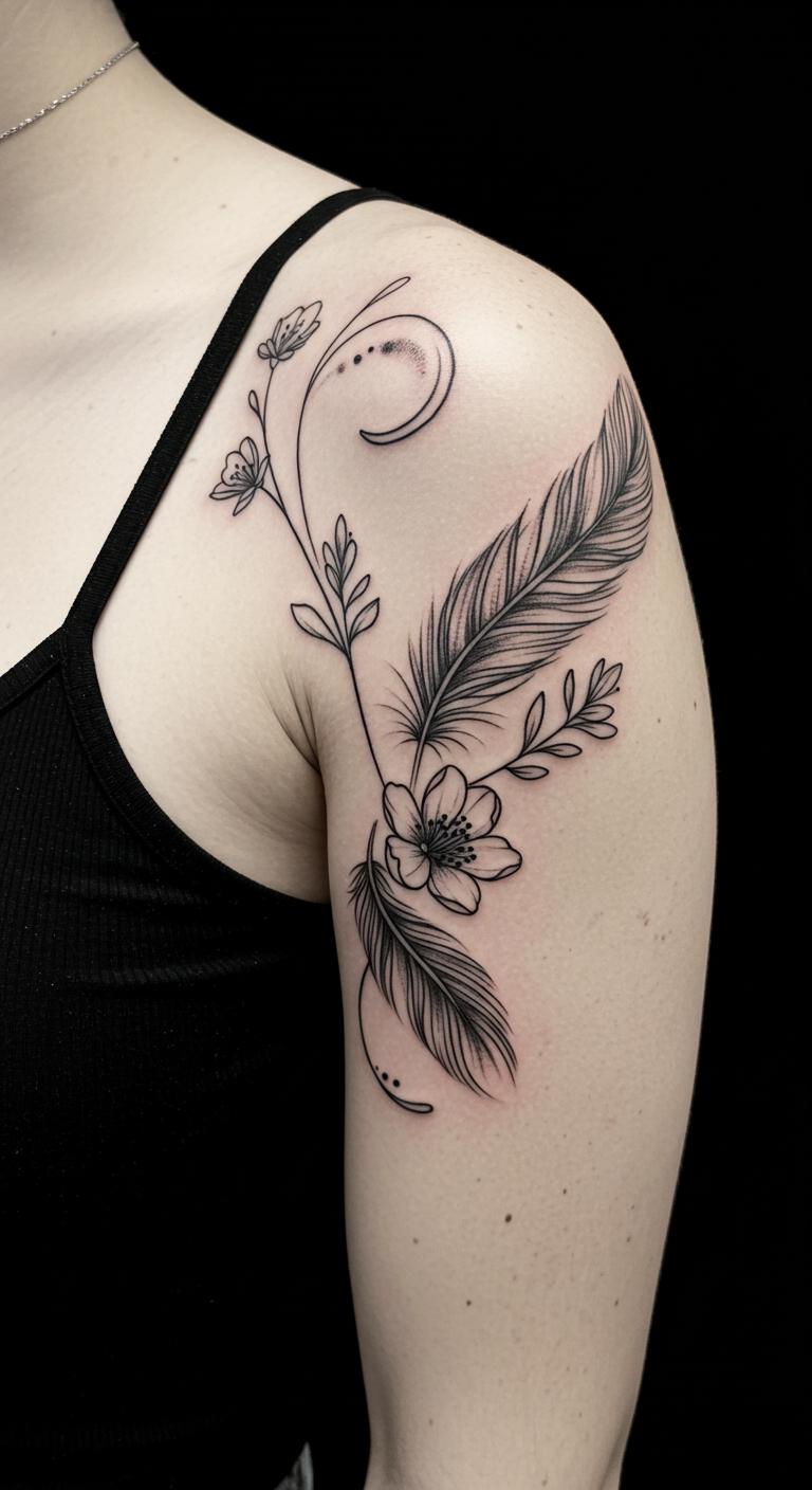 Flowers and feathers flow over ink. They disguise with style. Sketch petals on paper first. This saves money upfront. Go for your shoulder spot. These designs are minimal, reducing costs. Focus on curves. Split the plan simply. Free tools online assist. It’s like doodling at home. People see the beauty. Add a flower center for fun. Real advice: practice with markers. This method hides well.