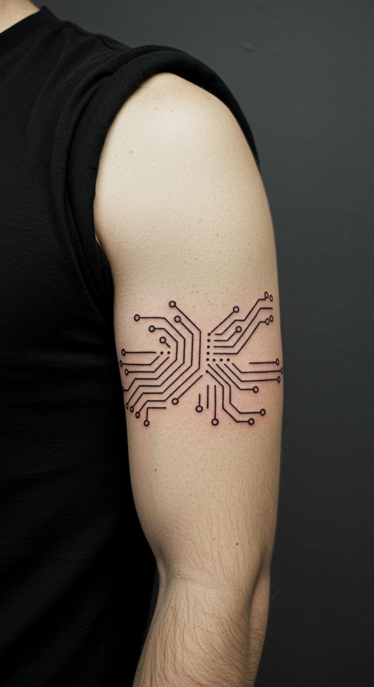 Tech motifs bring a futuristic vibe. Lines like circuits cover up nicely. Sketch gears on a notebook first. It helps without spending much. Place them on your arm for visibility. These designs use basic ink, keeping costs down. Start with straight lines for ease. Break it up: plan one element at a time. Free online tools let you mock it up. It’s like a DIY project at home. Folks say it updates old ink well. Customize with a small detail. Real tip: use a ruler for straight lines in your sketch. This makes the final tattoo pop.